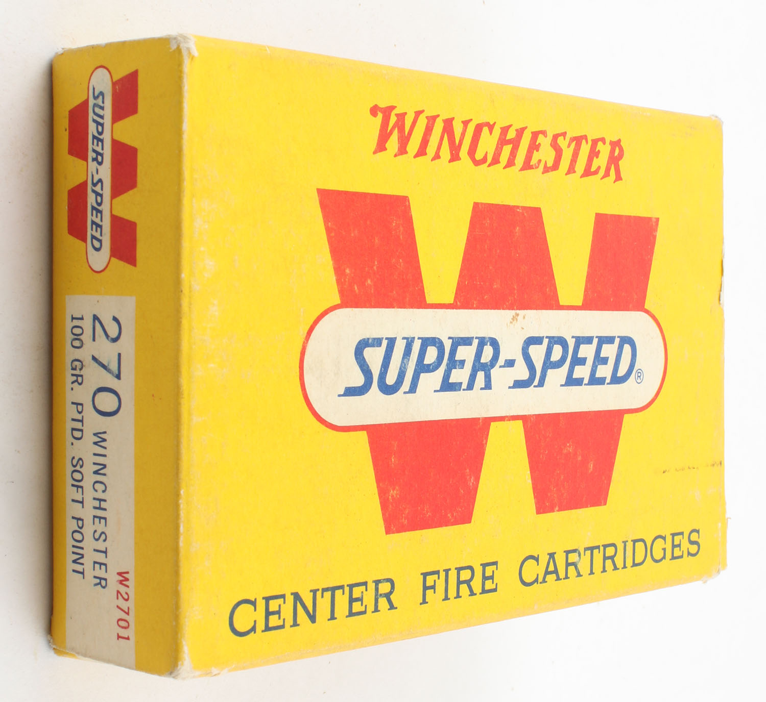 Winchester, Super-Speed, .270 Winchester, 100 Grain Soft Point, Full, 1pc. Yellow Red & white box, box is solid with very good to excellent color, minor age soiling & shelf wear, minor corner wear, end flaps are solid, ammo is excellent. Grade: Excellent - Value: 20 to 60