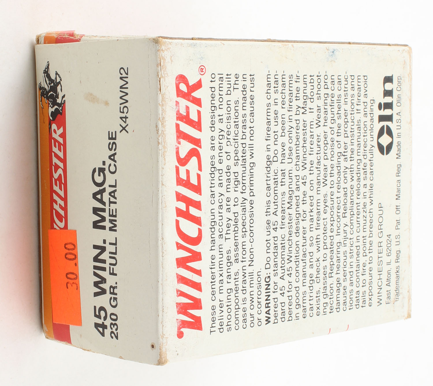 Winchester, Super X, .45 WIN. MAG., 230 Grain Full Metal Case, Full, 1pc., Multi-colored box, box is solid with good color, box has light age soiling & scuffing, end flaps are solid, ammo is excellent. Grade: Very Good ++ - Value: 20 to 30