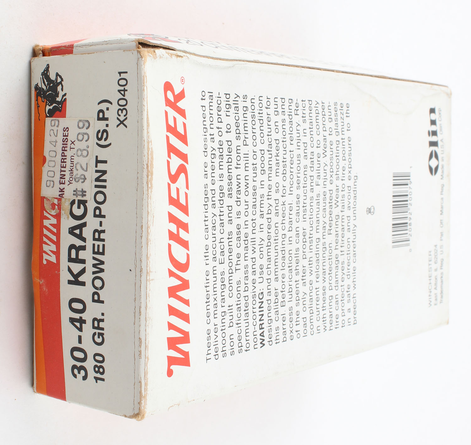 Winchester, Super-X, .30-40 Krag, 180 Grain Power Point (S.P), Full, 1pc., Gray red & orange box, box has scuffing with corner wear, has rub marks, end flaps are solid, ammo is excellent. Grade: Very Good - Value: 20 to 50