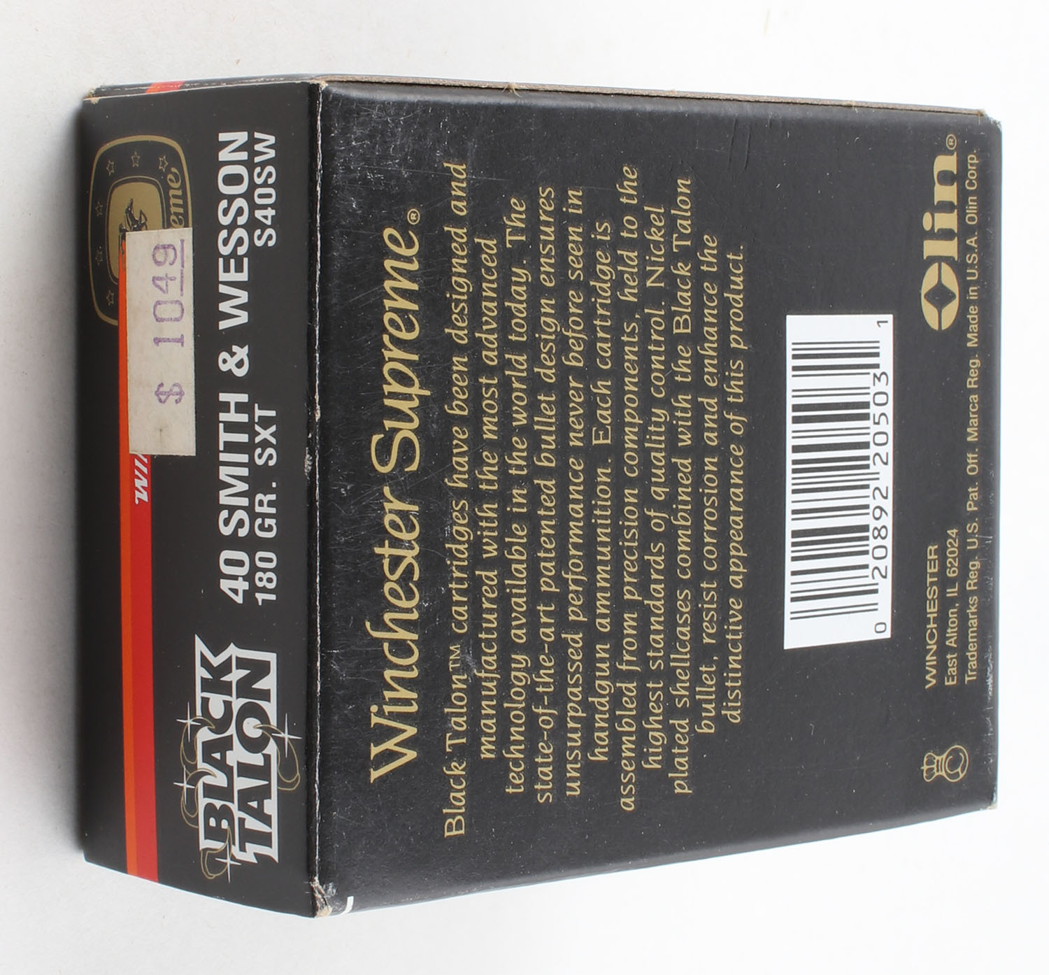 Winchester, Black Talon, .40 Smith & Wesson Hollow Point, 180 Grain SXT, Full, 1pc. Black box, box is solid with minty color, minor corner wear, end flaps are solid, ammo is excellent. Grade: Excellent + - Value: 40 to 100