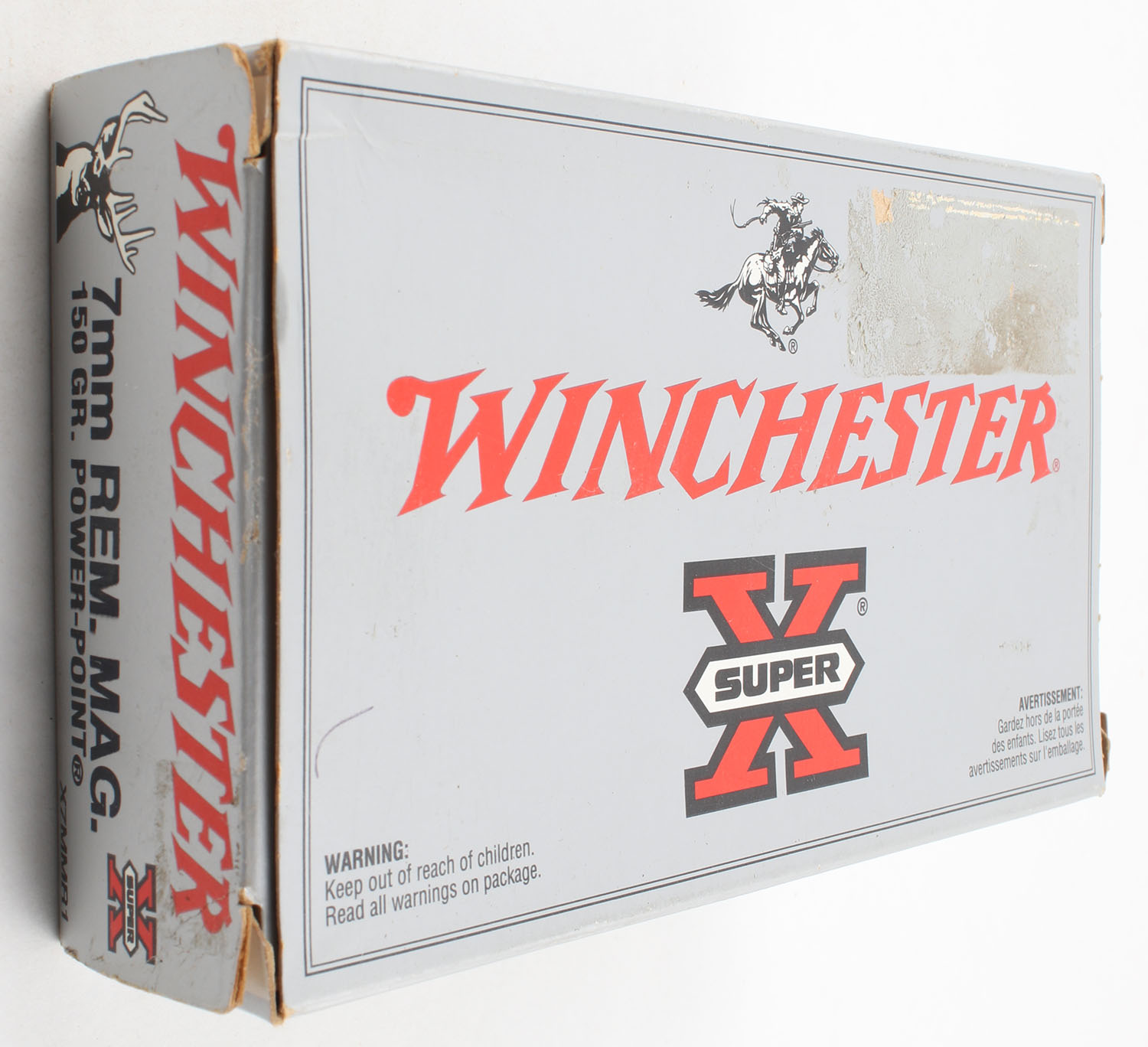Winchester, Super-X, 7mm Rem. Mag., 150 Grain Power Point, Full, 1pc., Silver & red box, box is solid with excellent color, has light scuffing with sticker residue on front, end flaps are solid, ammo is excellent. Grade: Very Good ++ - Value: 10 to 30