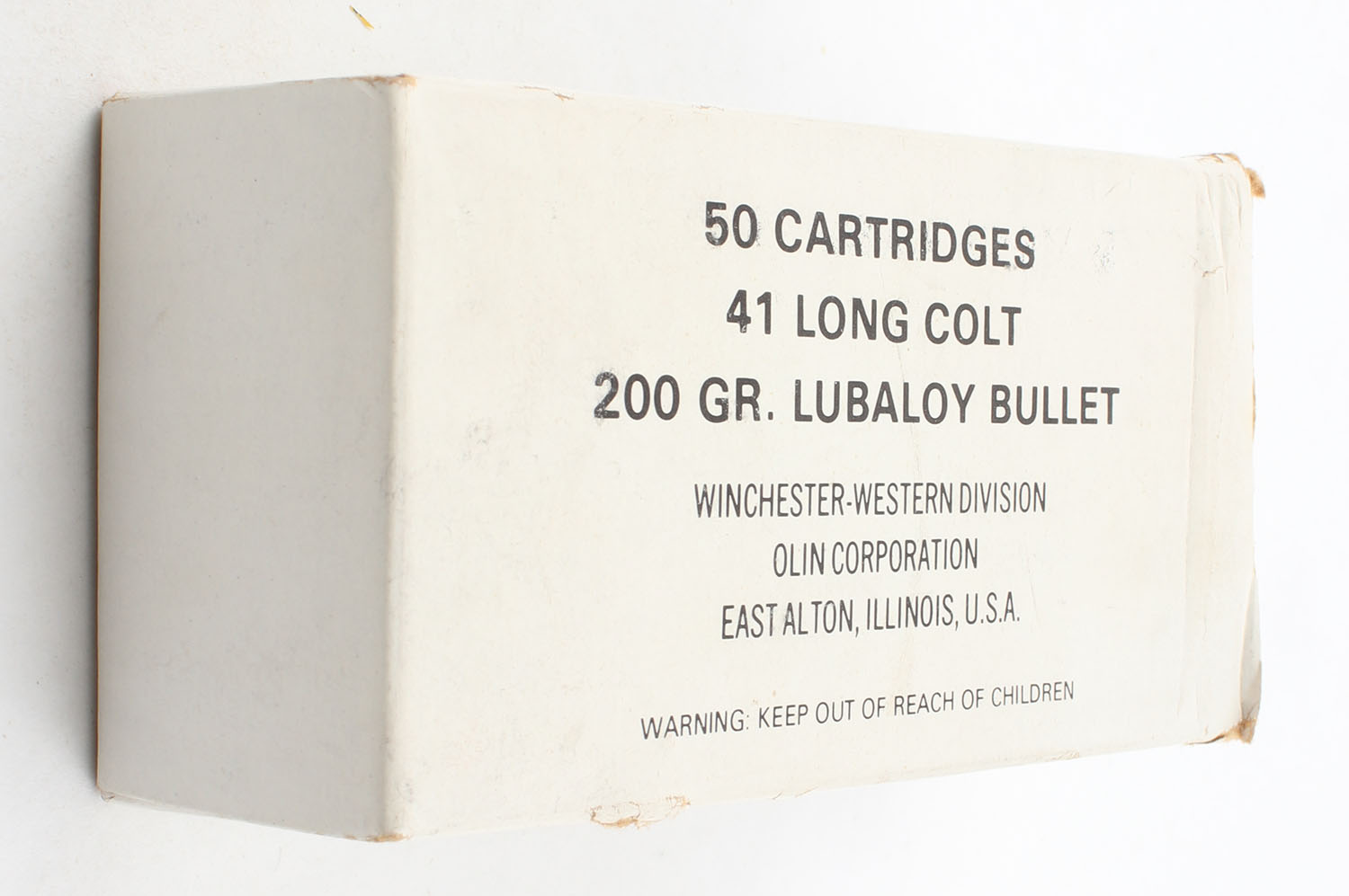 Winchester-Western, .41 Long Colt, 200 Grain Lubaloy Bullet, Full, 1pc. White box with black print, box is solid with light scuffing, minor corner wear, end flaps are solid, ammo is excellent. Grade: Very Good ++ - Value: 80 to 120