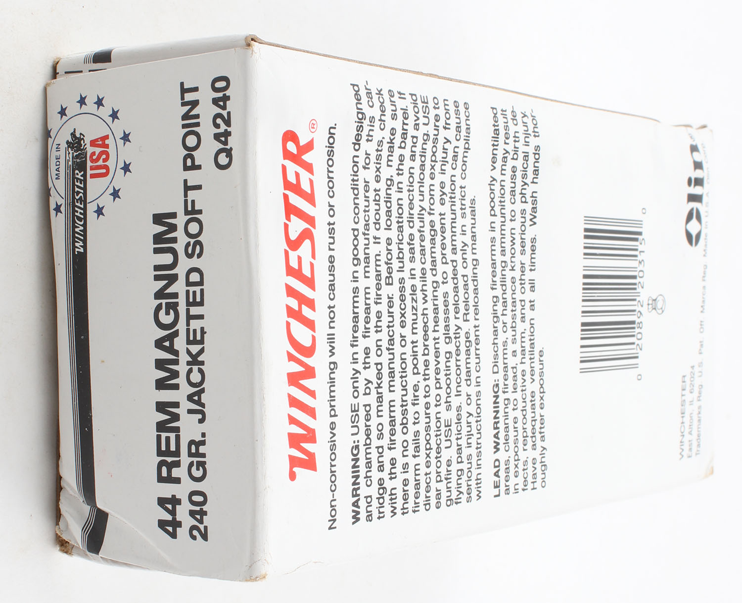 Winchester, USA, .44 Remington Magnum, 240 Grain Jacketed Soft Point, Appears Full, 1pc. White red & black box, box has scuffing with rub marks, edge & corner wear, end flaps are solid, ammo is excellent. Grade: Very Good - Value: 20 to 60
