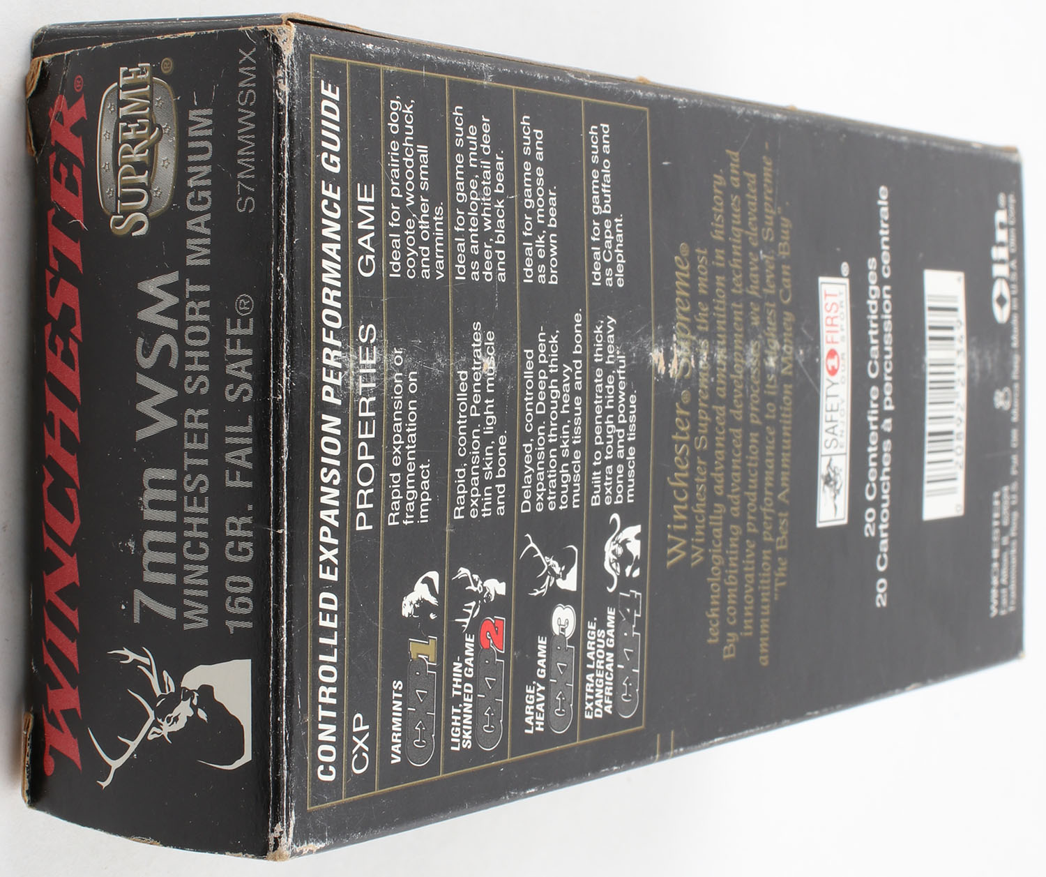 Winchester, Supreme, 7mm WSM, 160 Grain Fail Safe, Full, 1pc. Black & red box, box is solid with excellent color, minor shelf wear, some corner wear, edges are mostly crisp, end flaps are solid, ammo is minty. Grade: Excellent + - Value: 40 to 60