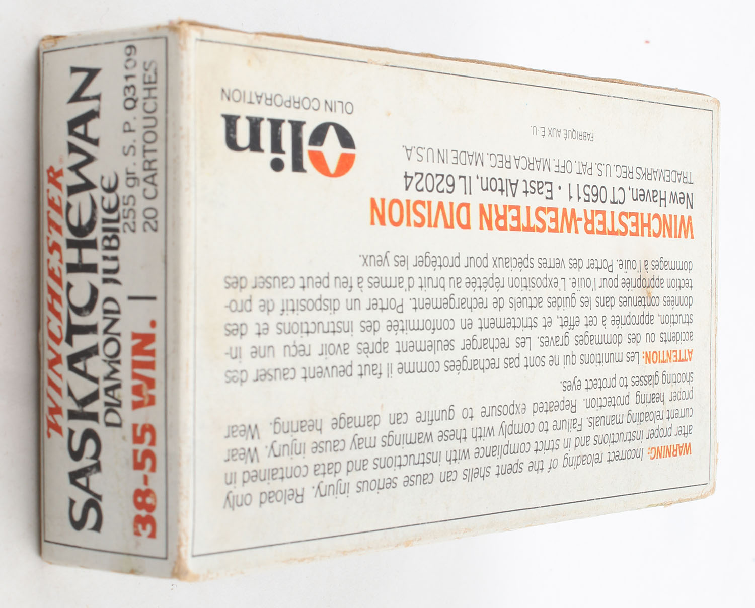 Winchester, Saskatchewan Diamond Jubilee, .38-55 Win., 255 Grain Soft Point, Full, 1pc., Multi-colored box, box is solid with very good color, has very minor age soiling, light edge & corner wear, end flaps are solid, ammo is excellent. Grade: Excellent - Value: 80 to 120