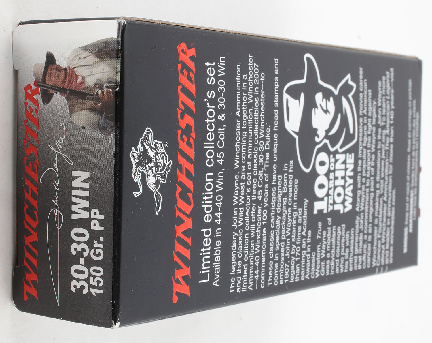 Winchester, 100 Years of John Wayne, .30-30 Winchester, 150 Gr. PP, Full, 1pc. Black silver & red box, box is MINT with minty color, corners are sharp, edges are crisp, end flaps are solid, ammo is minty. Grade: MINT - Value: 60 to 90