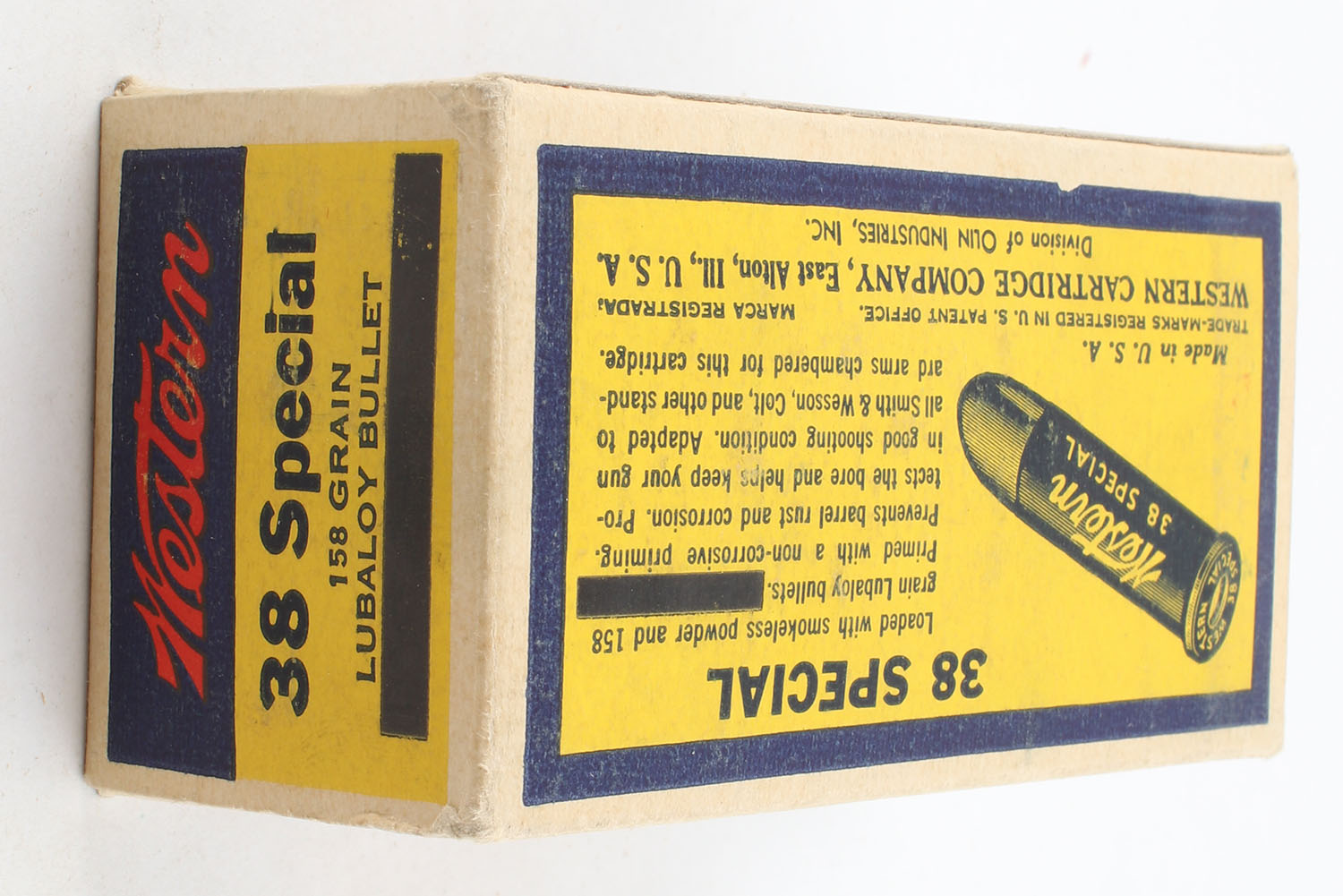 Western, Cartridges, .38 Special, 158 Grain Lubaloy Bullet, Full, 1pc. Yellow blue & red bulls eye box, box is very solid with excellent color, corners are sharp, edges are crisp, end flaps are solid, ammo is excellent. Grade: Excellent ++ - Value: 40 to 60