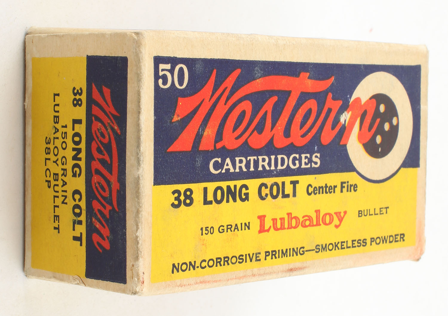 Western, Cartridges, .38 Long Colt, Center Fire, 150 Grain Lubaloy Bullet, Smokeless Powder, Partial 49rds. With 37rds. Being correct, 1pc. Blue yellow & red bulls eye box, box is very solid with excellent color, has minor shelf wear, end flaps are solid, ammo is very good. Grade: Excellent - Value: 30 to 90