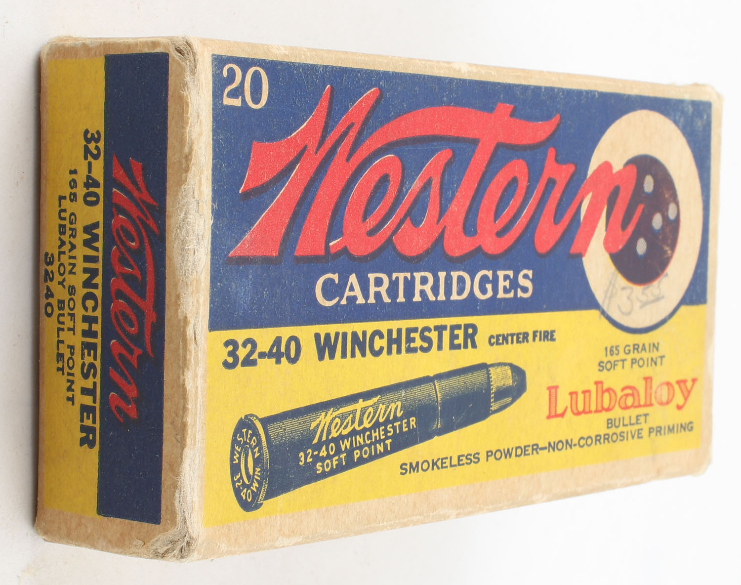 Winchester, Cartridges, .32-40 Winchester, Center Fire, 165 Grain Soft Point Lubaloy Bullet, Full, 1pc. Yellow blue & red bulls eye box, box is solid with excellent color, has light edge & corner wear, light shelf wear, end flaps are solid, ammo is very good. Grade: Very Good ++ - Value: 80 to 120