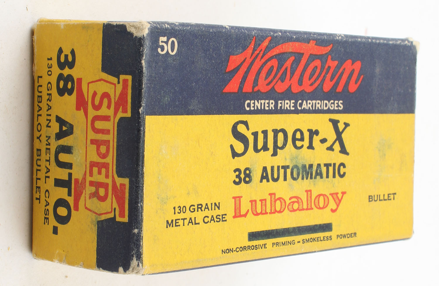 Western, Super-X, .38 Automatic, 130 Grain Metal Case Lubaloy Bullet, Full, 1pc. Yellow blue & red box, box is solid with very good color, has light scuffing, minor corner wear, end flaps are solid, ammo is excellent. Grade: Excellent - Value: 20 to 40