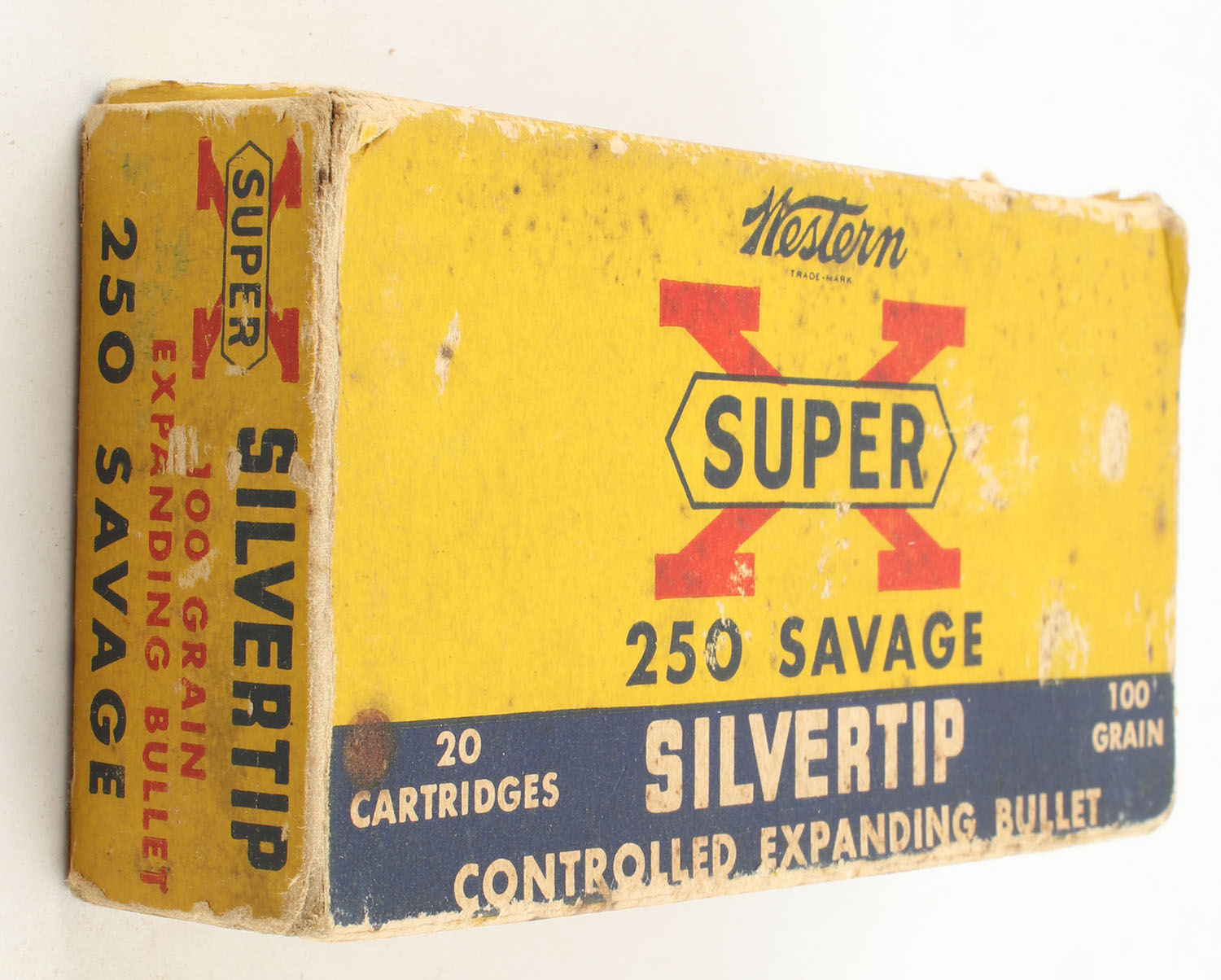 Western, Super-X Silvertip, .250 Savage, 100 Grain Controlled Expanding Bullet, Full, 1pc. Yellow blue & red box, box is solid with good color, has light age soiling with scuffing, edge & corner wear, end flaps are solid, ammo is excellent. Grade: Very Good - Value: 50 to 75