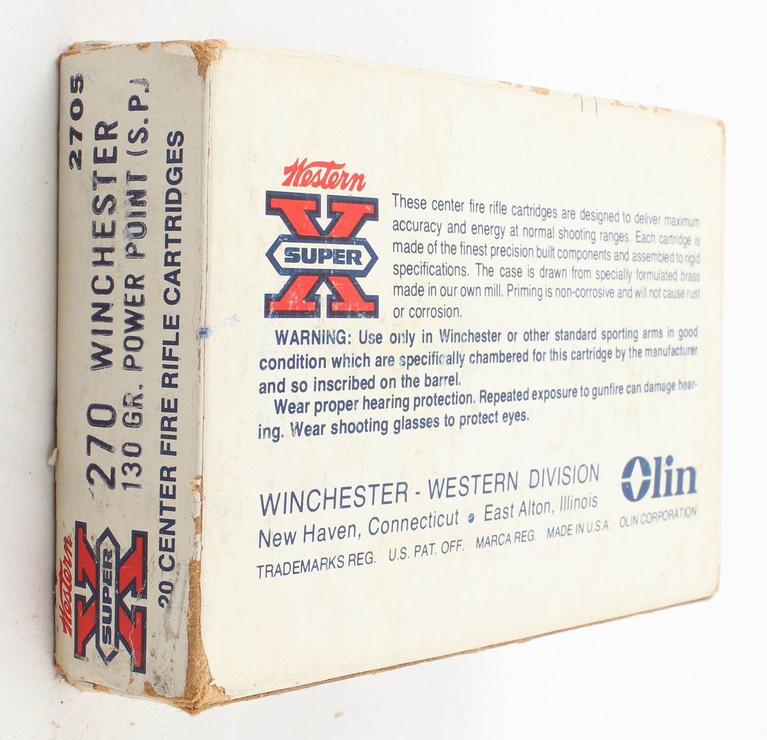 Western, Super X, .270 Winchester, 130 Grain Power Point, Full, 1pc. White red & black box, box is solid with very good color, has edge & corner wear, shelf wear, end flaps are solid, ammo is excellent. Grade: Very Good ++ - Value: 16 to 24