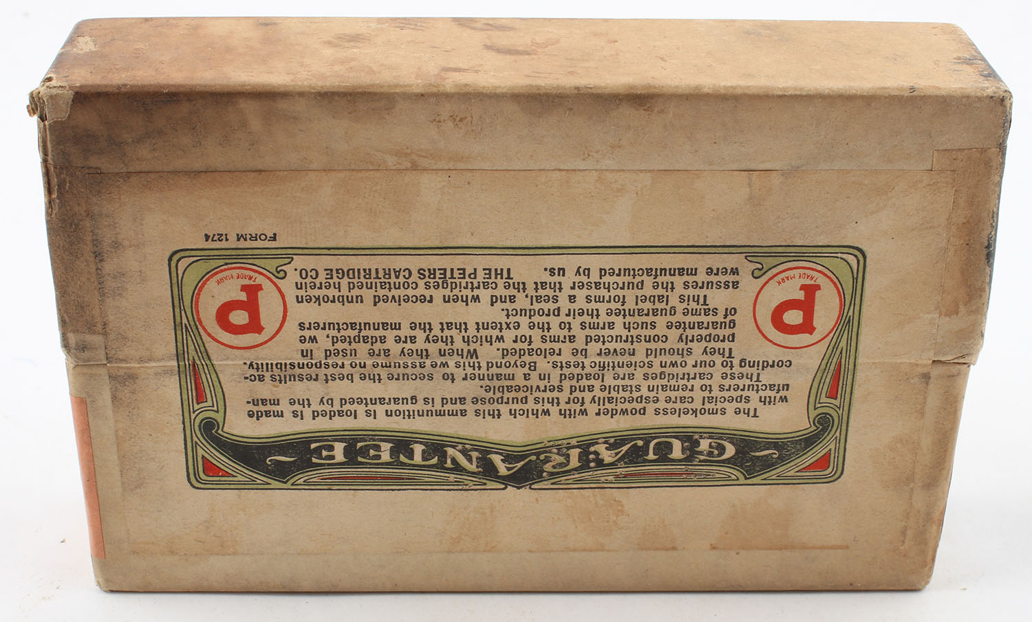 Peters, Center Fire Cartridges, .30-40 Krag-Jorgensen, 150 Grain Sharp Point SP Bullet, FULL & SEALED, 2pc. Buff box with salmon label & black print, box is very solid with excellent color to label, has scuffing with light age soiling, labels are intact. Grade: Excellent - Value: 30 to 100