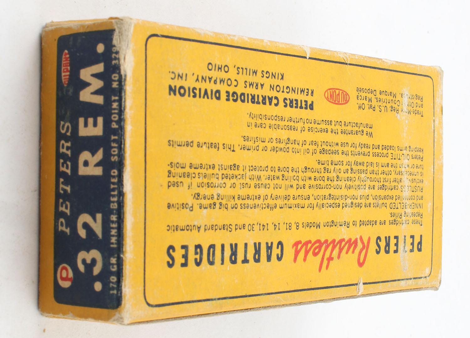 Peters, High Velocity, .32 Remington, 170 Grain Inner-Belted Soft Point Bullets, Full, 1pc. Yellow blue & red box, box is solid with very good color, has light scuffing, edge & corner wear, end flaps are solid, ammo is excellent. Grade: Excellent - Value: 40 to 60