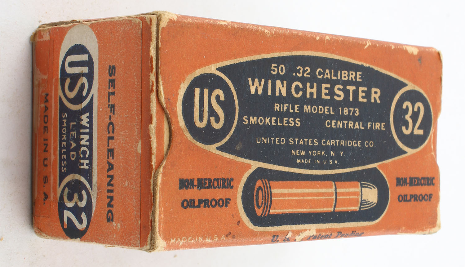 U.S. Cartridge Co., .32 Winchester, Self-Cleaning, Central Fire Smokeless, Full, 1pc. Orange & blue box, box has light age soiling, edge & corner wear, end flaps have tape repairs, ammo is excellent. Grade: Very Good - Value: 20 to 40