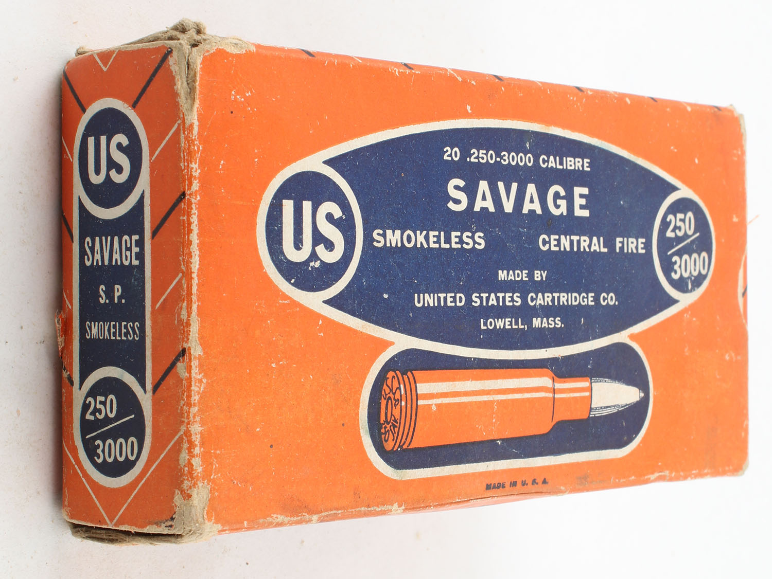 U.S. Cartridge Co., .250-3000 Savage, Smokeless Central Fire, Full, 1pc. Orange & blue box, box is solid with excellent color, has edge & corner wear, light scuffing, end flaps are solid, ammo is excellent. Grade: Very Good + - Value: 20 to 40