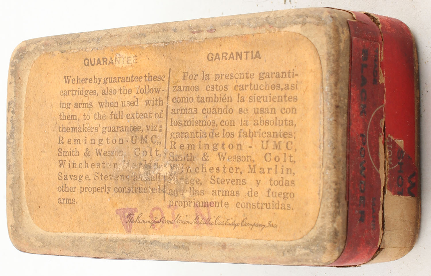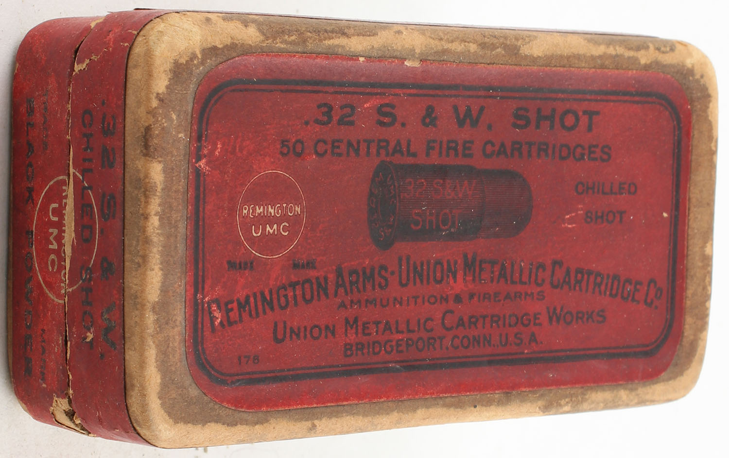 REM-UMC, .32 Smith & Wesson Shot, Central Fire Cartridges, Chilled Shot Black Powder, Full, 2pc., Buff box with red top & side sealing labels, box is solid with good color, has light age soiling, edge & corner wear, labels are intact, ammo is excellent. Grade: Very Good - Value: 20 to 80