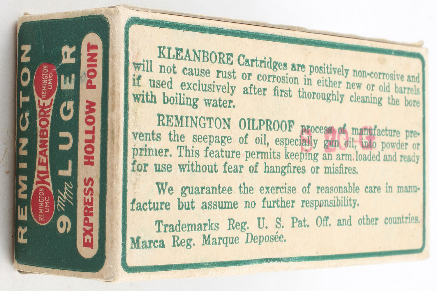 Remington, Kleanbore, 9mm Luger, 124 Grain Express Hollow Point Bullet, Full, 1pc. Green buff & red dogbone box, box is very solid with excellent color, has very minor edge wear, end flaps are solid, ammo is excellent. Grade: Excellent + - Value: 30 to 90