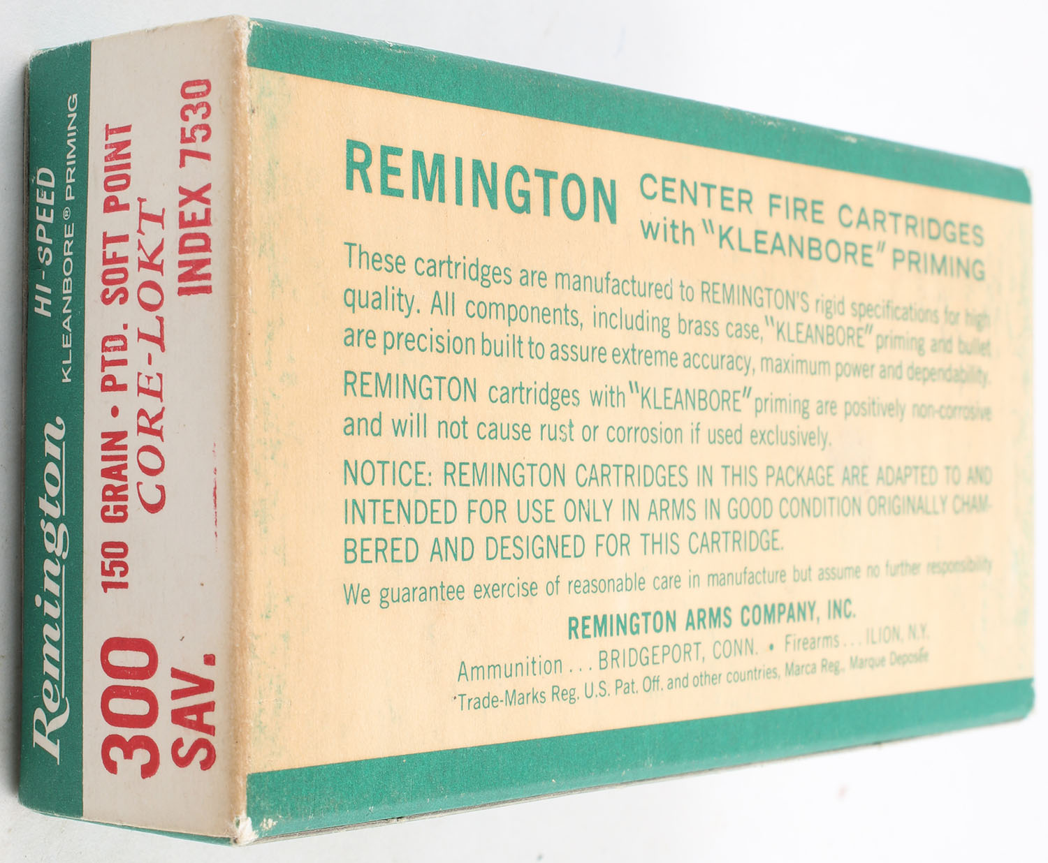 Remington, Hi-Speed, .300 Savage, 150 Grain PTD. Soft Point Core-Lokt, Full, 1pc, Green white & red box, box is very solid with excellent color, very minor shelf wear, end flaps are solid, ammo is excellent. Grade: Excellent + - Value: 20 to 60