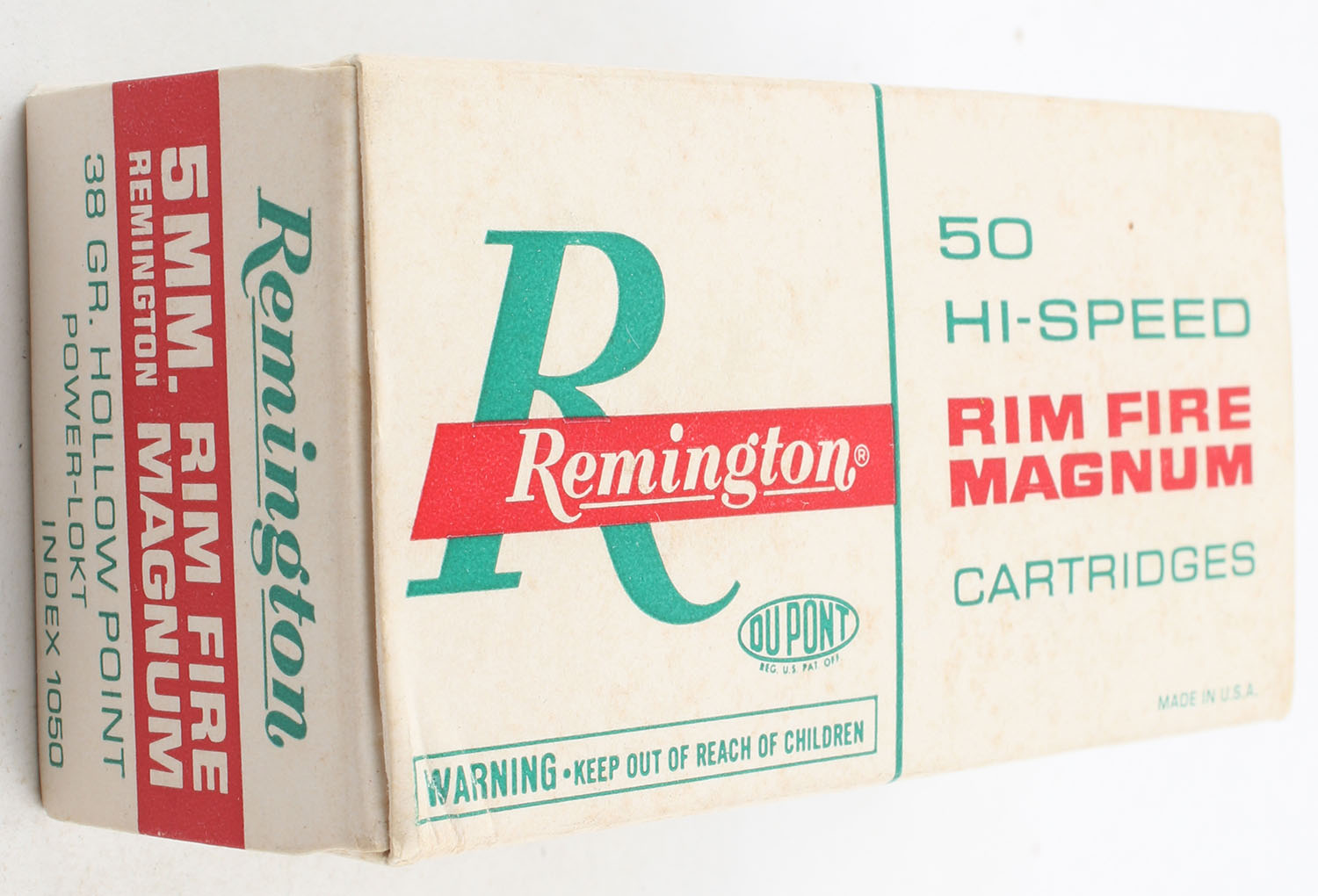 Remington, Hi-Speed, 5mm Remington Rim Fire Magnum, 38 Grain Hollow Point Power-Lokt, Full, 1pc. White red & green box, box is very solid with excellent colors, minor shelf wear, end flaps are solid, ammo is excellent. Grade: Excellent - Value: 40 to 100