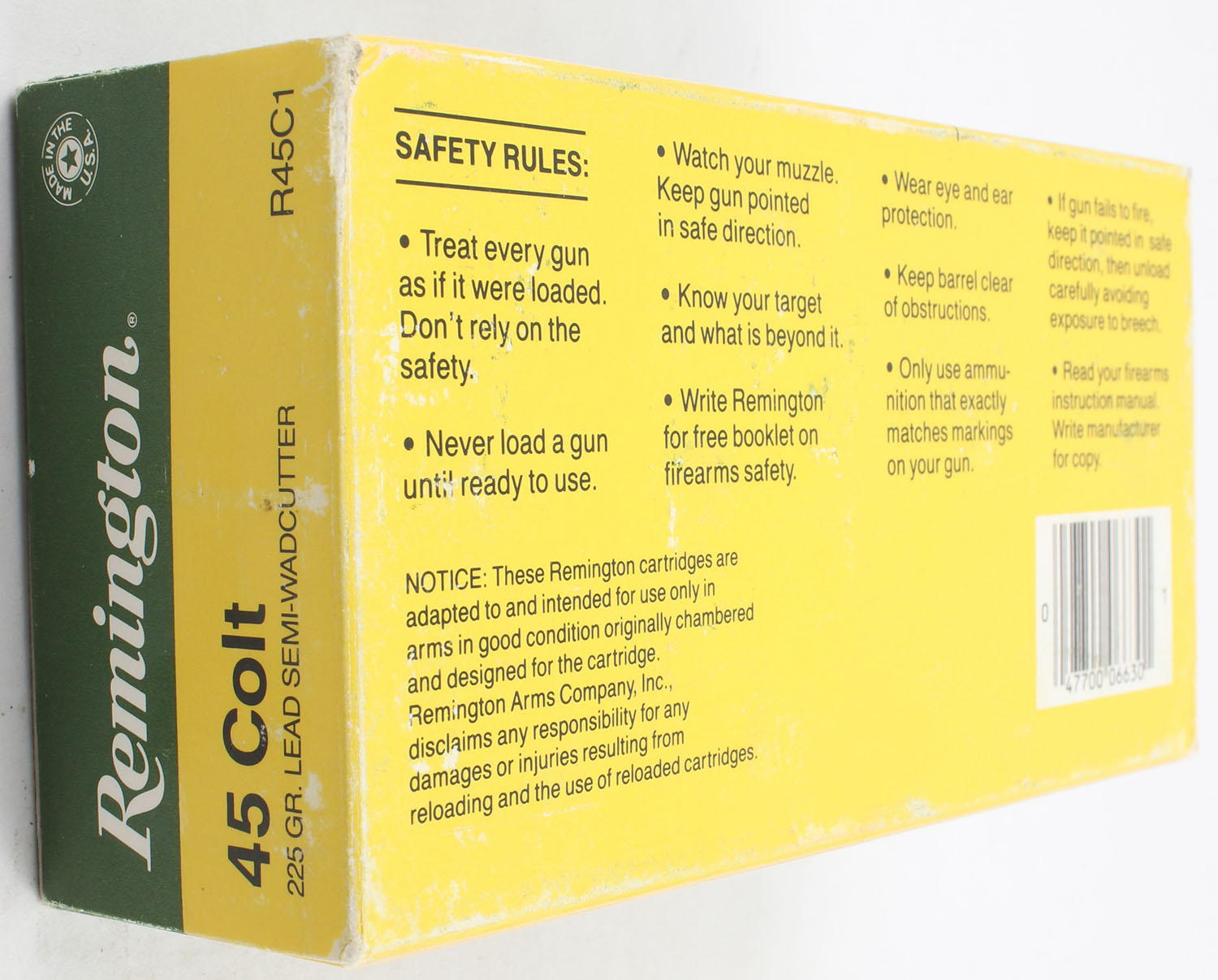 Remington, High Velocity, .45 Colt, 225 Grain Lead Semi-Wadcutter, Partial 41rds., 1pc. Green white & yellow box, box is solid with very good color, has light scuffing to top, light edge & corner wear, end flaps are solid, ammo is excellent. Grade: Excellent - Value: 40 to 60