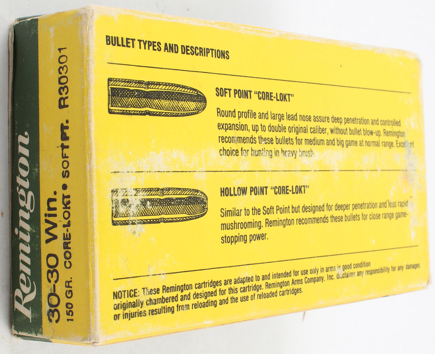 Remington, High Velocity, .30-30 Winchester, 150 Grain Soft Point Core Lokt, Full, 1pc. Green & yellow box, box is solid with good color, has scuffing, edge & corner wear, end flaps are solid, ammo is excellent. Grade: Very Good - Value: 20 to 40