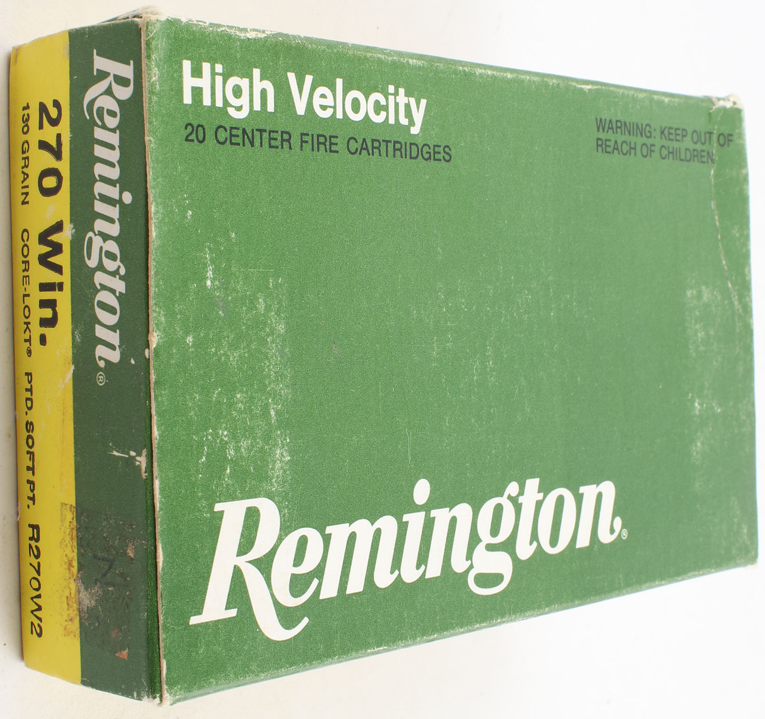 Remington, High Velocity, .270 Winchester, 130 Grain Core Lokt PTD. Soft Point, Full, 1pc. Green & yellow box, box is very solid with good color, has light edge & corner wear, minor scuffing, end flaps are solid, ammo is excellent. Grade: Excellent - Value: 10 to 40