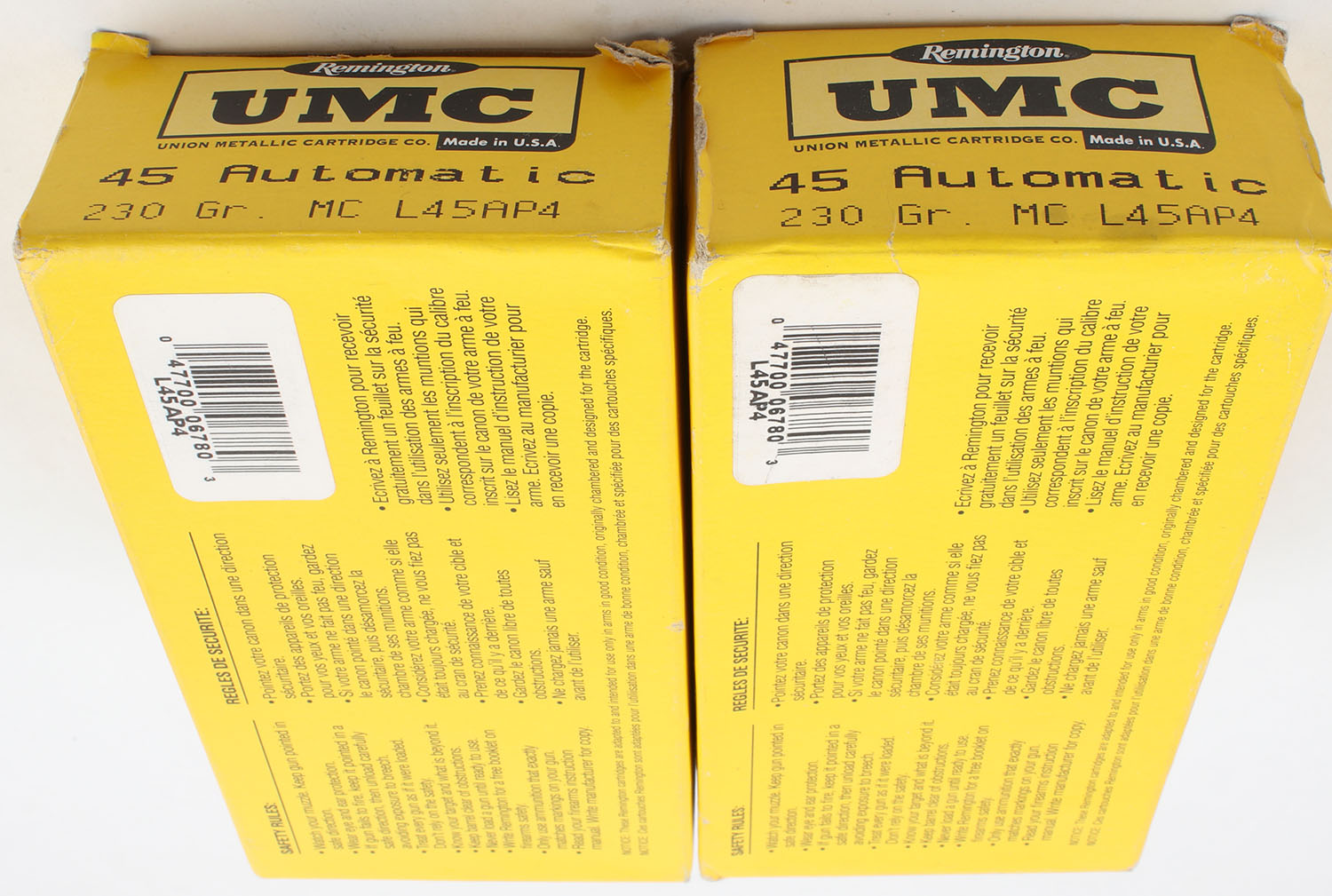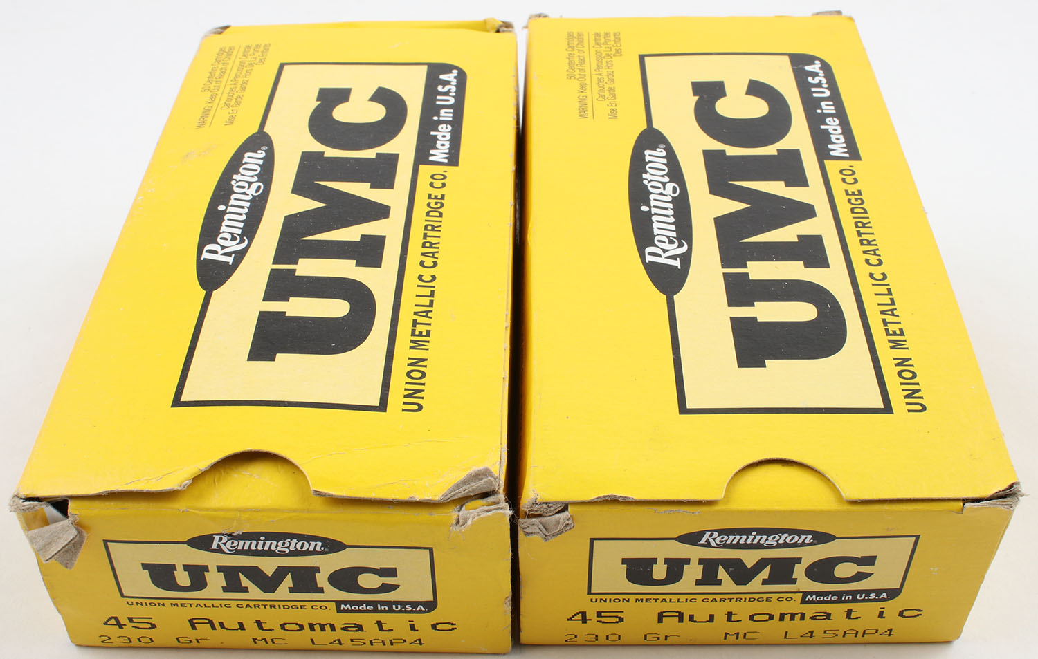 Remington, Lot of (2), UMC, .45 Auto, 230 Grain Metal Case, Full, 1pc. Yellow & black boxes, boxes are solid, end flaps are solid, ammo is excellent. Grade: Very Good ++ - Value: 20 to 60