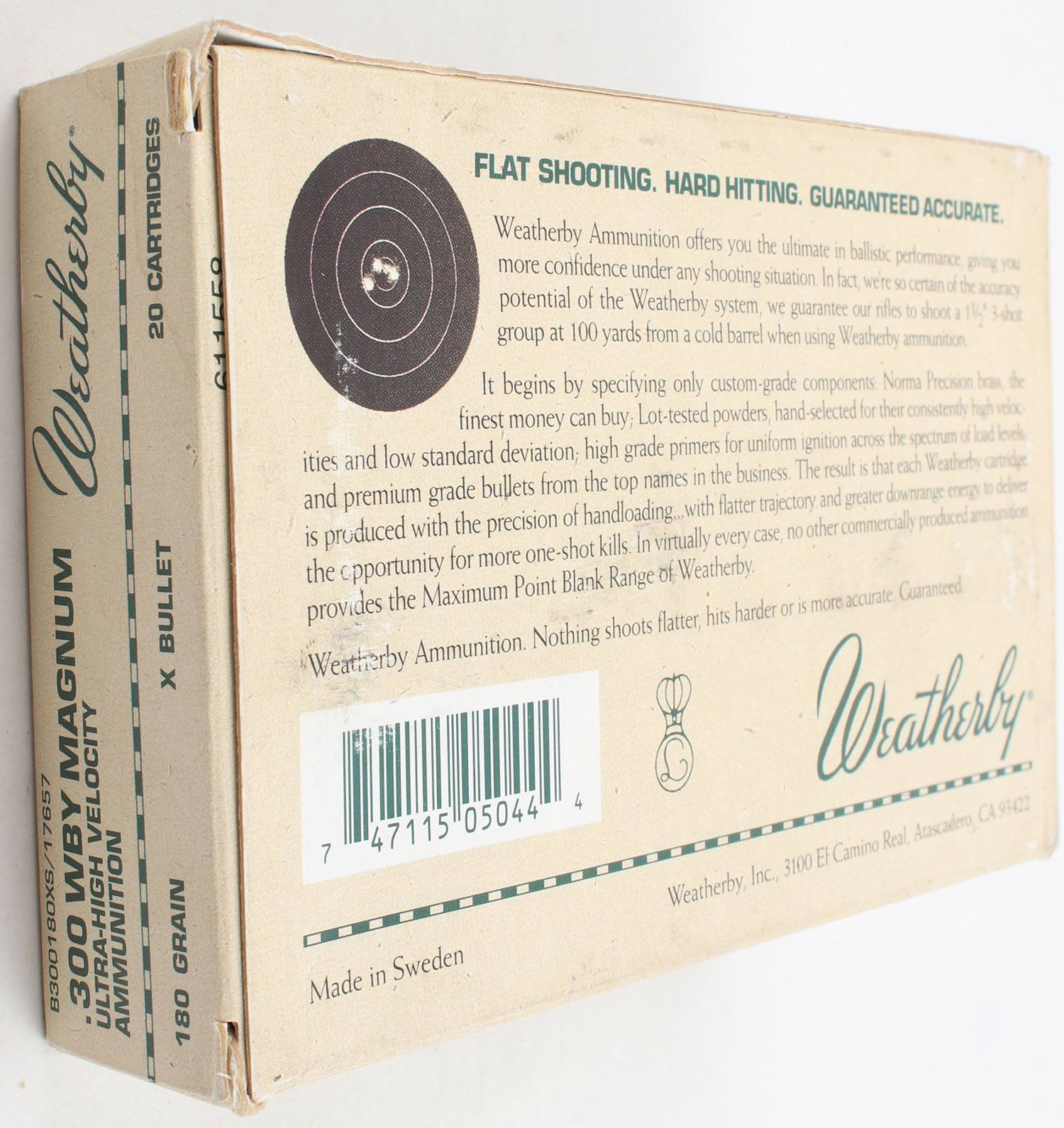 Weatherby, Ultra High Velocity, .300 Weatherby Magnum, 180 Grain X Bullet, Full, 1pc. Multi-colored Elk Box, box is solid with excellent color, has minor scuffing, end flaps are solid, ammo is minty. Grade: Excellent - Value: 40 to 80