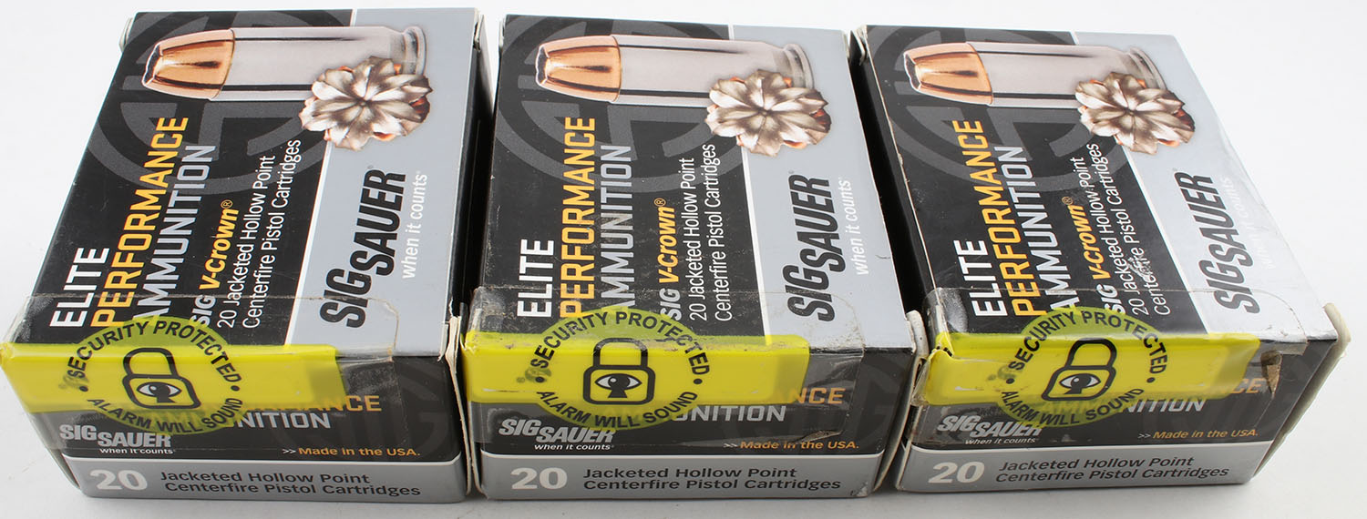 Sig Sauer, Lot of (3), Elite Performance, .40 Smith & Wesson, 165 Grain V-Crown JHP, Full, 1pc. Multi-colored box, box is very solid with excellent color, ammo is minty. Grade: Excellent + - Value: 40 to 60