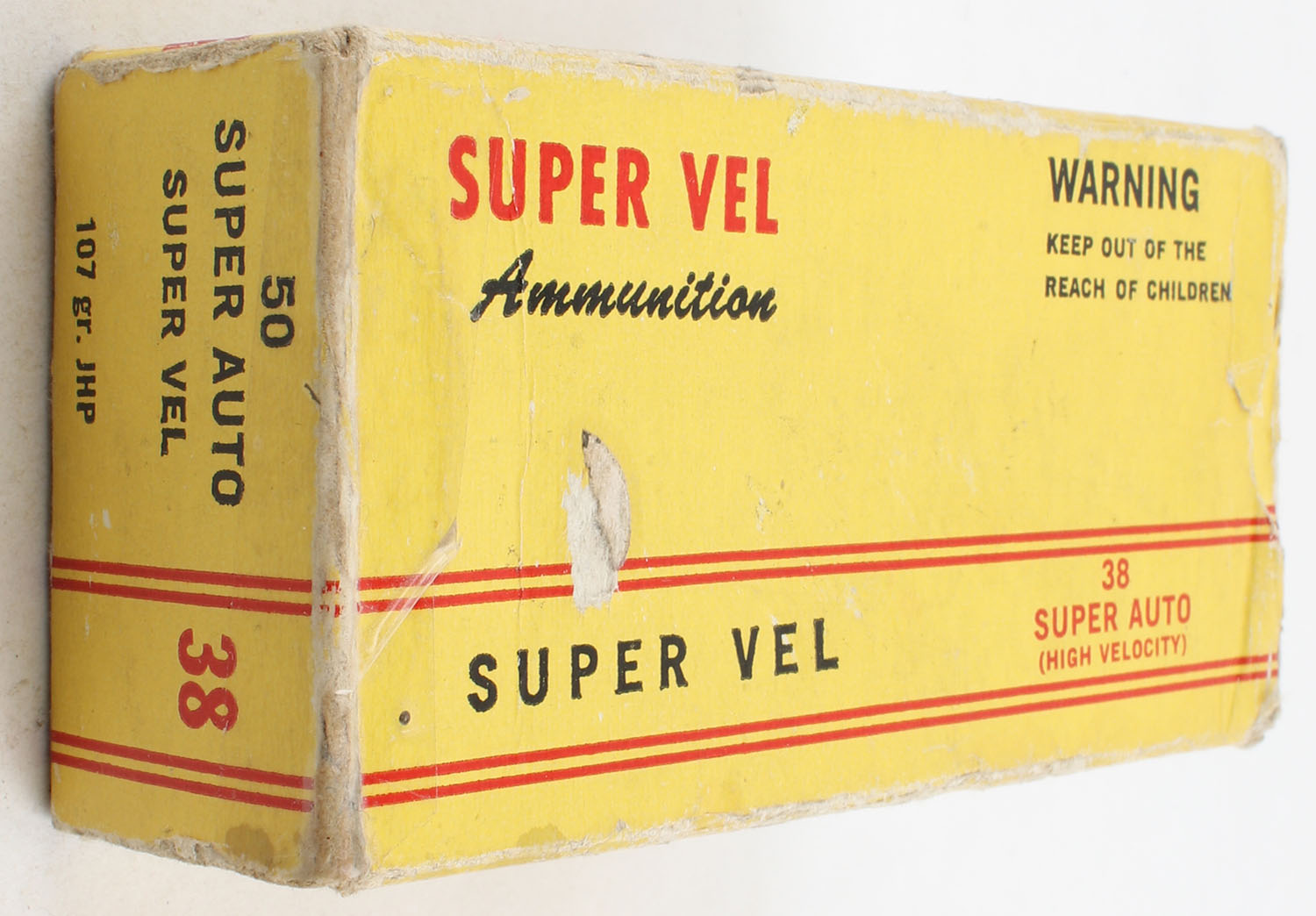 Super Vel, .38 Super Auto., 107 Grain JHP, Full, 1pc. Yellow box with red & black print, box has light age soiling, scuffing, edge & corner wear, ammo is excellent. Grade: Good ++ - Value: 10 to 40