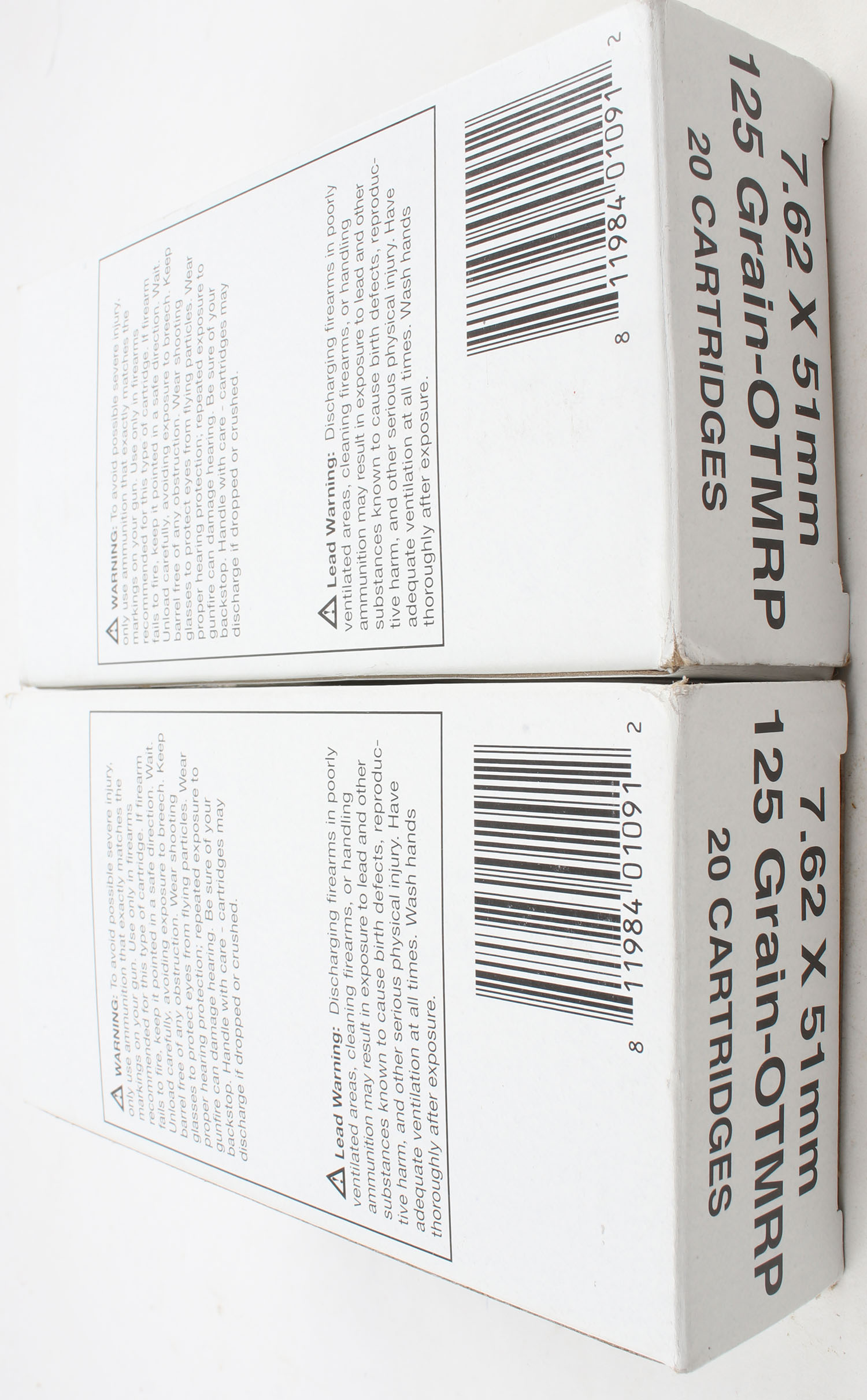 Unknown Mfg., Lot of (2) 7.62 x 51mm, 125 Grain OTMRP, Full, 1pc., white boxes with black print, boxes are very solid, ammo is very good. Grade: Excellent - Value: 20 to 30