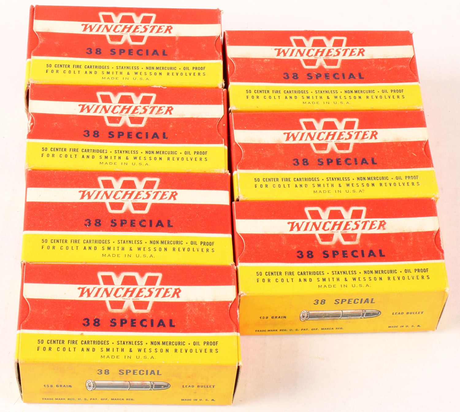 Winchester, .38 Special, 158 Grain Lead Bullet, Partial Wood Crate 2pc., Total of 7 boxes inside crate, (350rds.), 1pc. Boxes, multi-colored boxes are very solid with excellent color, ammo is excellent, crate is solid with red & black print. Grade: Excellent - Value: 100 to 400