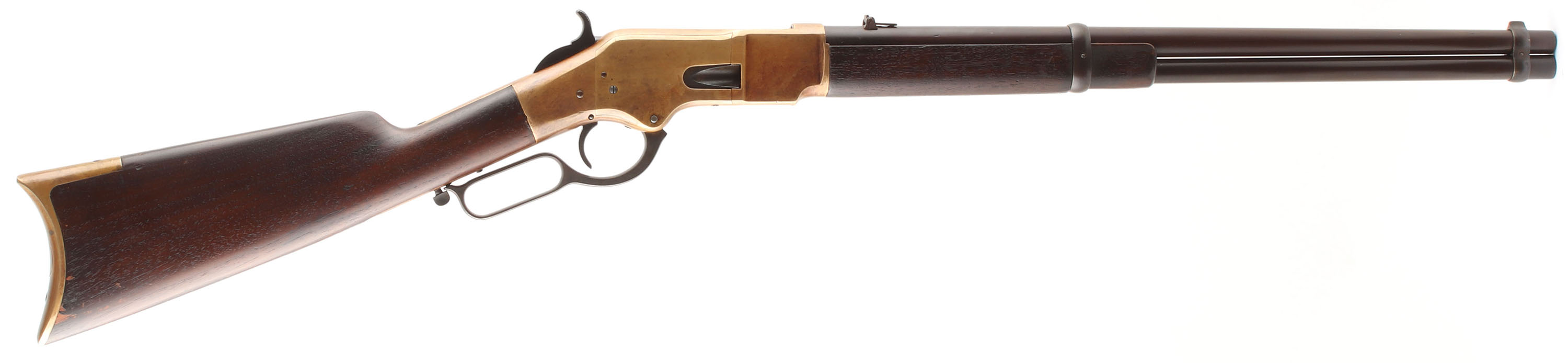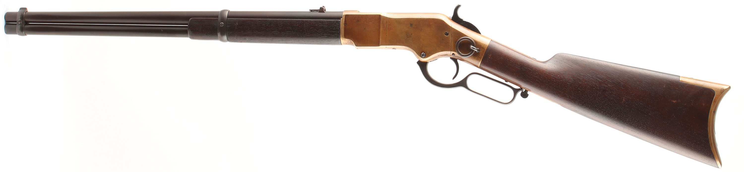 Winchester, Model 1866 Saddle Ring Carbine, 3rd variation, .44 Henry Cal., MFG. 1870, SN: 32417, Lever Action Carbine, 20'' Round barrel, Full mag. The original wood stocks are excellent & solid, displaying a mix of original finish, added finish & some protective oils, all of which give it a wonderful aged & rich tone. There are very few handling marks & light contusions. The top edge on both sides of the forend tip have a spliced sliver of wood replaced to correct previous damage & to restore the edge. This was professionally done & feathered in to match the surrounding wood & finish. There is a tight hairline crack at the forend tip. The fit of the wood to metal is excellent. Overall, the stocks retain an excellent appearance. The metal has an even & rich deep chocolate brown patina. The brass receiver & buttplate are developing a very nice aged patina. Bore is very good, with some areas of cleaned roughness amongst strong rifling. The barrel carries the original flip-up rear sight, with 1,3 & 5 markings for 100, 300 & 500 YDS & a standard pinch blade barrel band front sight. The address atop the barrel is still sharp & very clear. Stock carries a brass flip-up trapdoor crescent buttplate, with a correct 3 piece cleaning rod held within. Staple mounted saddle ring. The SN is block stamped on the lower tang. Tight, smooth action & appears mechanically sound. This 1866 SRC has a great aged appearance & appears well maintained.* Antique, No FFL Req. - - Value: 7000 to 12000
