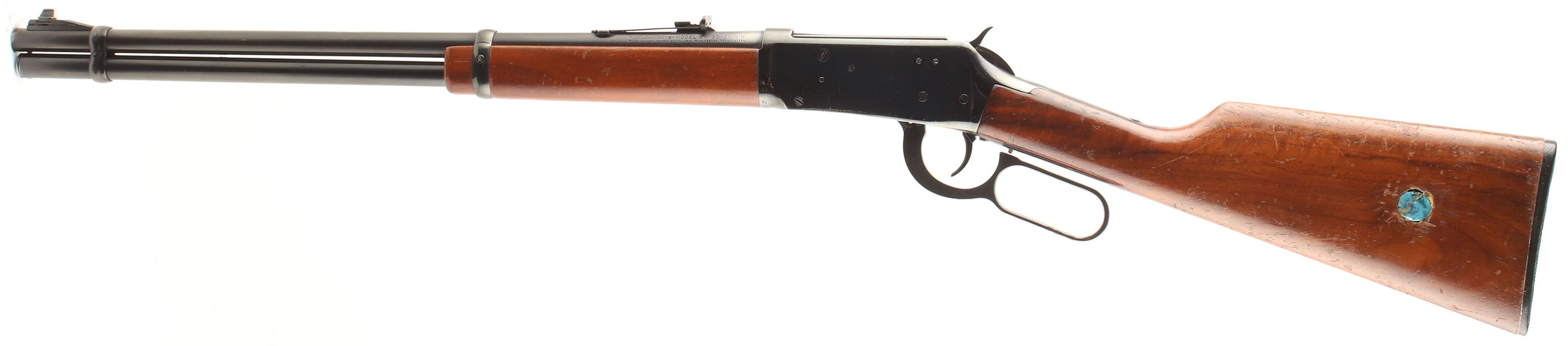 Winchester, Model 94 Carbine, CAL: 30-30 (30 WCF), MFG: 1978, SN: 4639112 , Lever Action Carbine, 20'' Round barrel, Full mag. The straight grip wood stocks are very good & solid, however someone tried to inlay something into the left side of the stock. It now has a large blue plug on the left & a small carved indent on the right. There are other minor handling marks & scratches to the thinning & flaking original finish. The original metal blue finishes rate 90% on the barrel & mag tube, while the receiver rates 80%, with much of the loss being a speckled loss & edge wear. Bore is excellent. The barrel is fitted with an adjustable rear sight & a ramped blade front sight. The left side of the receiver carries the two hole factory provision for receiver side mounted sights. Stock carries a Winchester checkered plastic buttplate. Smooth tight action. A solid & high original condition 30-30 carbine setup ready for the hunt. FFL or C&R Req. - Value: 400 to 800