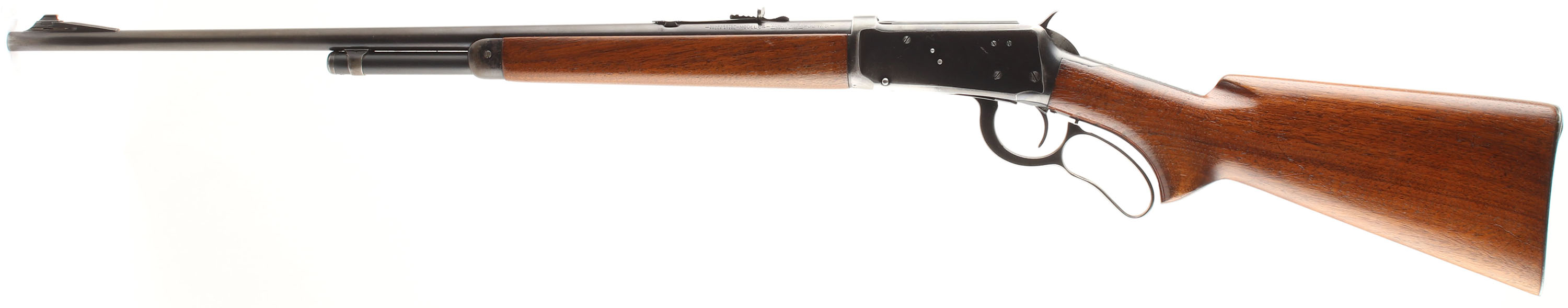 Winchester, Model 64, marked 32 W.S., MFG. 1942, SN: 1331164, Lever Action Rifle, 24 3/8'' Round barrel, 2/3 rd. mag tube. This is one of the rarer & fewer made Winchester models produced, with only 66,783 total rifles. The original flat pistol grip wood stocks are excellent, with a few minor scratches & contusions to the original finish, with a thin added layer. There is a small edge chip, with a bit of fill on the pistol grip edge. The metal blue finish rates 70%on the barrel & receiver, 80% on the mag tube. The barrel carries an adjustable rear sight & ramped blade front sight. Factory widow's peak checkered metal buttplate. Excellent bore. A sharp presenting & fairly rare rifle. FFL or C&R Req. - Value: 1200 to 1800