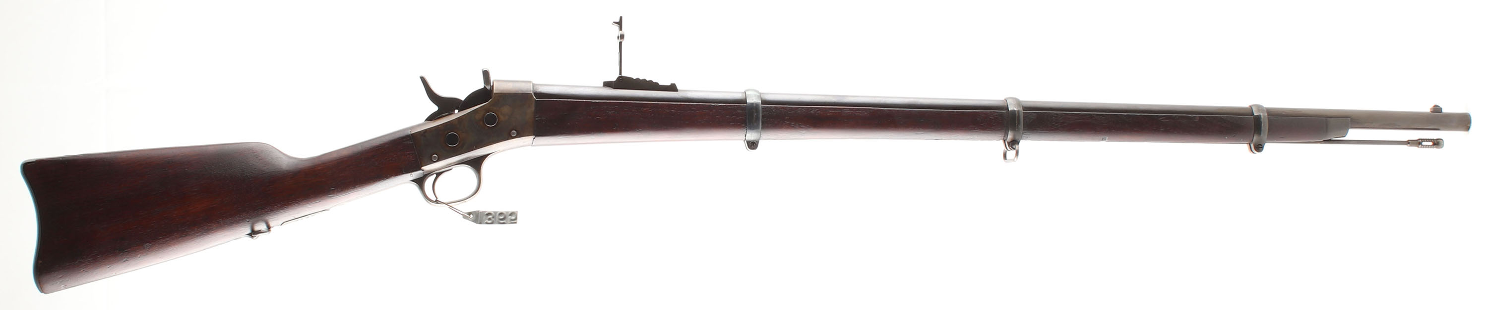 CONDITION: The two-piece, straight wrist walnut stock is excellent with only superficial nicks & dings from handling & storage (there is one larger ding at the toe). The bottom of the wrist has the Velocity data plate added on by the lab. The receiver retains 98% of its beautiful case-hardened finish with the barrel retaining 95% of its coverage with spots of thinning & starting to tone brown & actually rates 90%. The upper tang is marked with the three line 'REMINGTON'' address & patents ending in ''1874''. The top of the barrel, between the rear & middle bands is engraved ''43 Spanish Rec'd Mar. 21 1900. W.R.A.Co.''. All three barrel bands marked ''U'' on the left side. The bore is excellent. It's bright & mirrorlike with little to no visible wear. The barrel holds a small barleycorn front sight with a stepped base/ladder V-notch rear sight marked 2 to 4 on the base & the ladder is unmarked. The stock carries a steel buttplate, toned to a mix of thinned blue, gun metal gray & brown patina. The rifle has both factory sling loops,& has the cleaning/clearing rod. Mechanical function appears solid. A unique example of one of Winchester buy a rifle from one of their biggest rivals Remington for testing to make sure they were making the superior product. Antique, No FFL Req - Value: 1500 to 3000