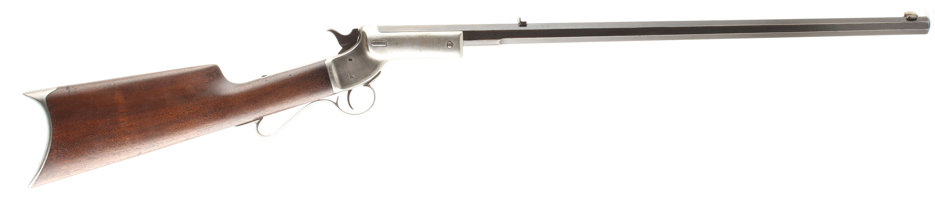 J. Stevens A & T. Co., Model No. 1 Tip-Up Rifle, Cal: 25 RF, MFG: 1888-95, SN: 26327, Single shot, tip open, 23 3/4'' Octagon barrel, The original straight grip wood stock is excellent, with very few light handling marks to the original finish. This model produced without a forend. Left side of barrel is marked ''J. STEVENS A. & T. CO. CHICOPEE FALLS.MASS. PAT.SEPT.6.1864''. The metal blue finish to the barrel rates 60%, toning to a brown patina as it thins. The receiver is silver. Scalloped trigger guard. The barrel carries a fixed rear & a elongated blade front sight. Bore is good, with areas of roughness amongst strong rifling. Stock carries a crescent metal buttplate. This is a nice looking representative example of the Stevens tip-up rifle. Antique, No FFL Req - Value: 600 to 900