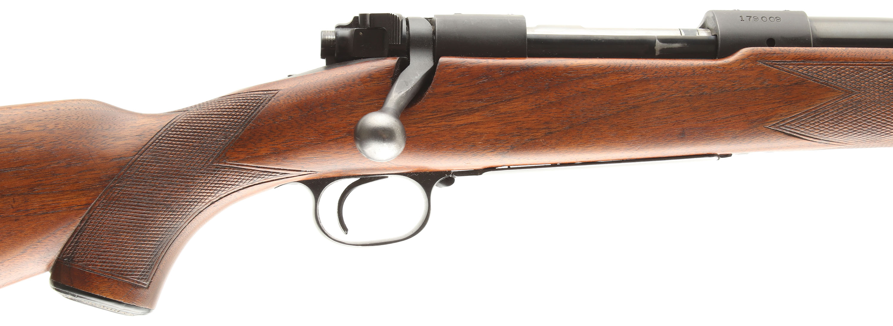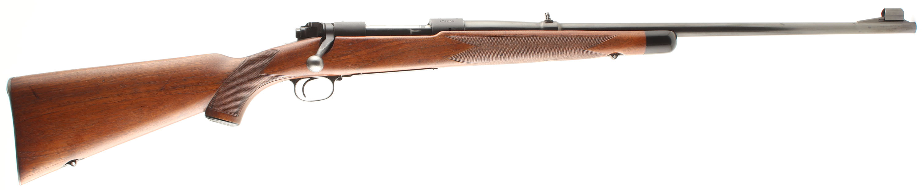 Winchester, Model 70 Super Grade, CAL: 257 Roberts, MFG: 1951, SN: 179009, Bolt Action Rifle, 24'' Round tapered barrel. The factory walnut wood stock has the Super Grade raised cheek piece, deluxe wrap-around checkering, plastic pistol cap & ebony forend tip. The stock appears to have been cleaned & carries the original finish, with added oils some time ago. There are minor scratches, scrapes & handling marks. The original metal blue finishes rate 90% on the barrel & receiver, while the floorplate & trigger rate 70%. Bore is excellent & bright. The barrel holds a folding leaf flip-up rear & a hooded ramp front sight. The receiver is factory tapped for scope mounts. SN matching bolt. Buttstock carries the original widow's peak, checkered metal buttplate. Sling provisions. A collectible Super Grade model 70 in one of the rarer or more expensive calibers amongst collectors. FFL or C&R Req. - Value: 2500 to 4000