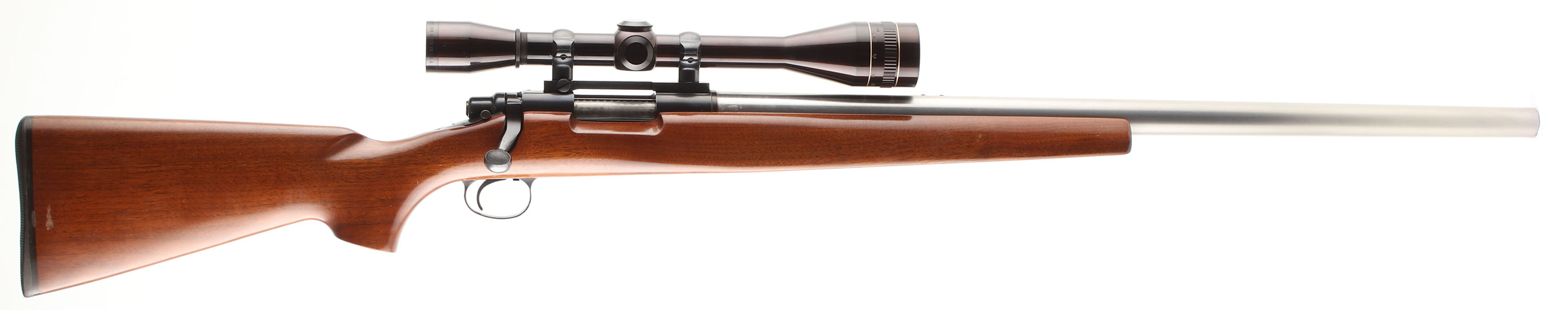Remington, Model 40-XBR Rangemaster Centerfire Single Shot, CAL: 223 REM, MFG: 1975, SN: 45113B, Bolt Action Single Shot Rifle, 26'' barrel. Built by Remington Custom Shop. The original flat pistol grip & wide forend grip target style stock is excellent. There are a few handling marks to the finish. The bright finished stainless steel barrel is excellent. The metal blue finish on the receiver rates 90%. Bore is excellent. The receiver carries a Leupold 12X scope, held by a Leupold base. Stock carries a Remington solid recoil pad. Jeweled bolt. A must-have rifle for bench or target shooters. FFL or C&R Req. - Value: 800 to 1500