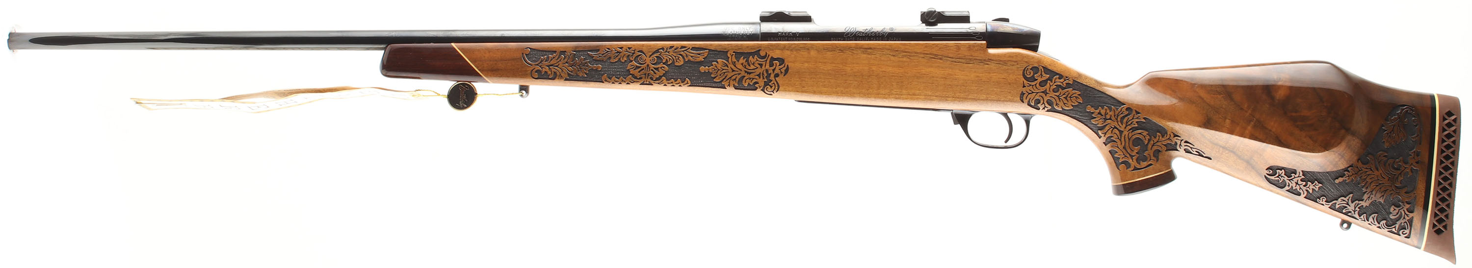 BOXED Weatherby, Mark V Lazermark, CAL: 270 WBY MAGNUM, MFG: 1985, SN: H187411, Bolt Action Rifle, 24'' barrel, Japan production. This gun was gun store owner vintage backstock that remained in the box & was never assembled. The hang tag remains on the forend & original grease was removed for pictures. Has the original rubber protective coating still on the bolt handle. The original cheeked & Monte Carlo stock is excellent, with carved grips & rose wood forend tip & pistol grip cap. There are virtually no handling marks to the excellent original finish. The original metal blue finish rates 100% overall. Bore is excellent. The receiver carries Weatherby scope mounts, while the barrel has no open sight provisions. Stock carries a Weatherby ventilated recoil pad. Sling studs. Comes in the original SN matching box, with paperwork. Basically a NOS firearm. An overall minty & sharp looking carved Mark V. FFL Req. - Value: 1500 to 3000