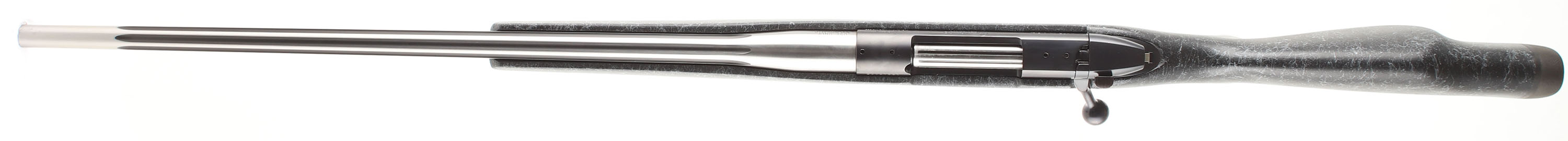 BOXED LEFT HANDED Weatherby, Mark V ACCUMARK, CAL: 300 Weatherby Magnum, MFG: 1995-2004, U.S.A., SN: SB057557, Bolt Action Rifle, 26'' Stainless fluted barrel. The original cheeked & pistol grip, hand-laid, raised Monte Carlo fiberglass stock, with matte gel coat & spiderweb accents is excellent. The 2-toned black & silver, Spun Stainless w/ Graphite Black Cerakote, fluted barrel is excellent both on exterior & bore. The factory metal blue finish rates 99% overall. The receiver has four open factory provisions for future scope mounting, with no open sight provisions on barrel. Stock carries a Decelerator solid recoil pad. Sling studs missing. Nearly new backstock inventory of gun store owner. Comes in the factory SN matching box, with paperwork. A high quality LEFT HANDED hunting rifle in overall excellent condition. FFL Req. - Value: 1500 to 2200