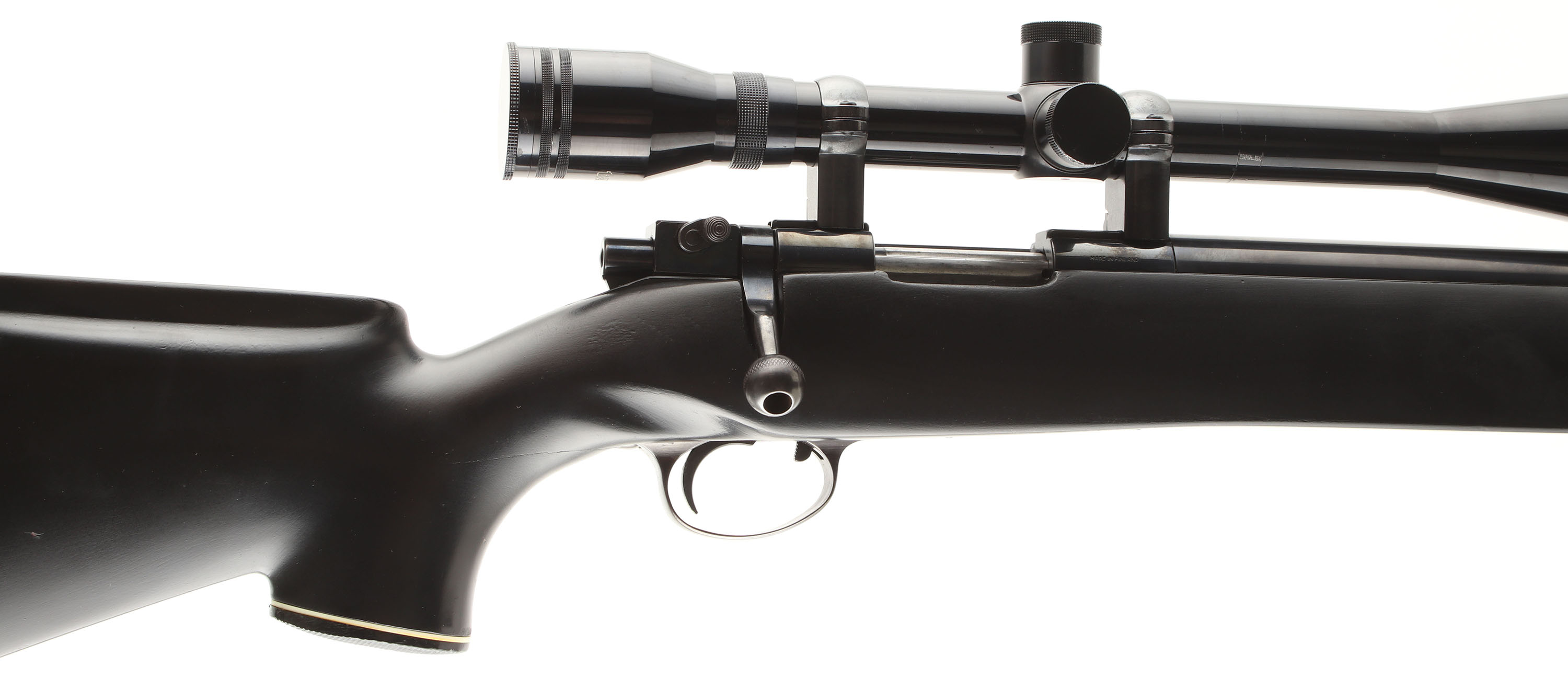SN: 40832, Bolt Action Rifle, 24 1/4'' Round Bull Barrel. The cheeked & capped pistol grip wood stock is very good & solid, with a wide grip bench target style forend. The stock has a tight 2.5'' hairline crack emanating from the trigger guard back across the left side of the pistol grip & a few other minor rubs to the excellent black paint finish. The metal blue finish rates 90% on the barrel & receiver, while the finish on the trigger guard, mag & floorplate has worn thin & toned plum brown. Bore is excellent. Receiver mounted with a Tasco 24x44 scope, with sun shade & cap. The barrel has no open sight provisions. The stock carries a Herter's checkered black plastic buttplate. Caliber marked detachable mag. FFL or C&R Req. - Value: 500 to 800