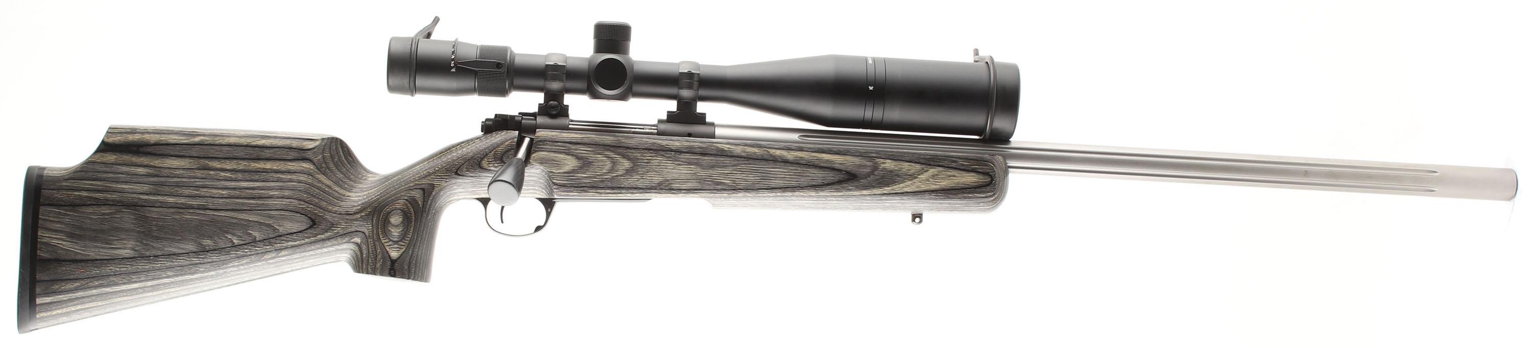 Kimber (NY), Model 84M Longmaster VT, CAL: 22-250 REM, MFG: Modern, SN:KM43757, Bolt Action Rifle, 26'' barrel. The grey, tan & black laminated & flat pistol grip wood bench stock is excellent, with a couple of minor rubs to the excellent original finish. The factory stainless steel fluted heavy barrel is excellent. The original metal satin blue finish on the receiver rates 99%. Bore is excellent. The receiver holds a Vortex Viper 6.5-20X50 Long Rang scope mounted on Leupold mounts, with sun screen & rubber caps. No open sight provisions. Carbon fiber bolt handle. Buttstock carries a Kimber solid recoil pad. Sling studs. FFL Req. - Value: 1400 to 2000
