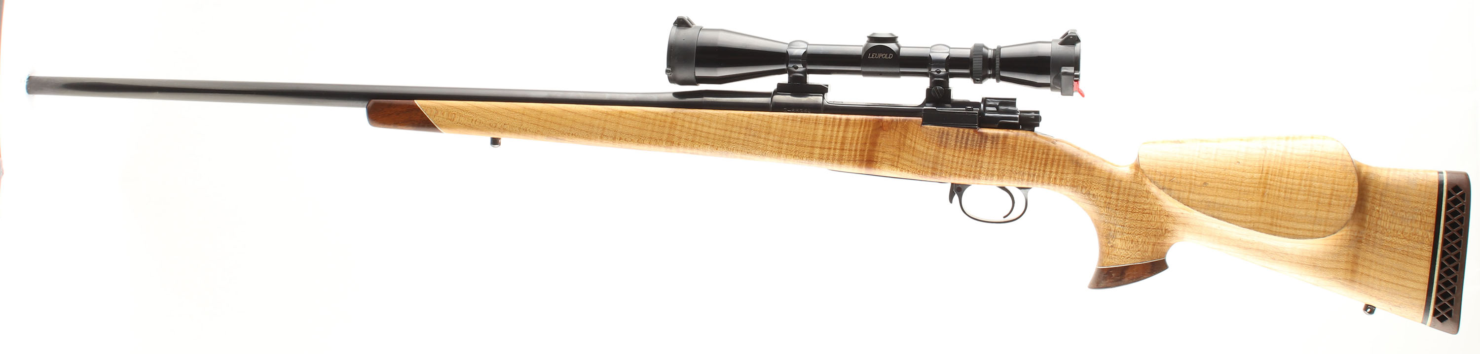 Custom Built Rifle, Built from a Commercial Mauser Action, CAL: 7MM REM MAG, MFG: 1940's-80's, SN: Z-55354, Bolt Action Rifle, 22 1/4'' Round barrel. This rifle was built in the mid 1980's by Carmichael Gun Shop in Carmichael CA. The action carries ''Z'' prefix SN denoting it is from the Santa Barbara Spain factory, known for the high quality actions intended for the commercial & custom built market. The custom curley maple stock carries a cheeked & capped pistol grip Monte Carlo style, with slanted rosewood forend tip & pistol grip cap. The stock is wood is excellent, but it does display lots of scratches, scrapes & finish thinning & wear, most of the wear exhibited on the back right side portion of the stock. The metal blue finish rates 90% overall. Some additional wear on the trigger guard & floorplate, which is stamped ''5465''. The receiver carries a Leupold 3-9 VARI-X IIc scope, with flip-up caps, on Redfield mounts, with no open sight provisions on the barrel. The consignor indicated that Carmichael's utilized a Douglas custom mid-weight barrel, but it carries no markings. Bore is excellent. Stock carries a Pachmayr White-line ventilated recoil pad. Sling studs. Jeweled bolt. Recently tuned-up at a licensed gunsmith. A very well built & customized hunting rifle. FFL Req. - Value: 800 to 1500