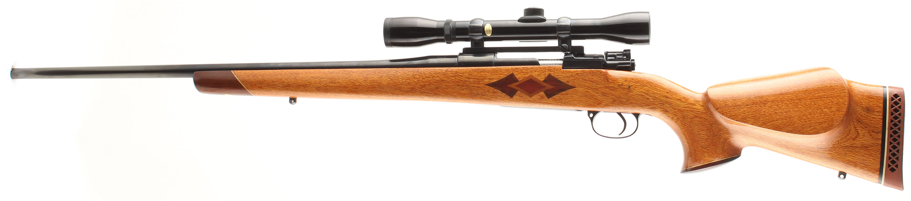 Custom Built Rifle, Built from a Fabrique Nationale Belgium M1924 Action, CAL: 243 WIN, MFG: 1924-30 Action, SN: 26563, Bolt Action Rifle, 22'' Round barrel. The custom cheeked & capped pistol grip Monte Carlo style wood stock is excellent, with slanted rosewood forend tip & pistol grip cap. The stock exhibits inlays on the forend tip, sides of the stock under receiver, right side of lower stock & pistol cap. There are a few very minor scratches, scrapes & scuffs to the excellent finish. Overall appearance of the stock is excellent. The metal blue finish rates 95% overall. The receiver carries a Bushnell Banner 4X scope on Redfield mounts, with no open sight provisions on the barrel. The barrel has only the caliber marking, while the receiver carries the SN stampings. Bore is excellent. Stock carries a Pachmayr White-line ventilated recoil pad. Sling studs. Jeweled bolt. An excellent customized military action to hunting rifle build. FFL or C&R Req. - Value: 600 to 1000