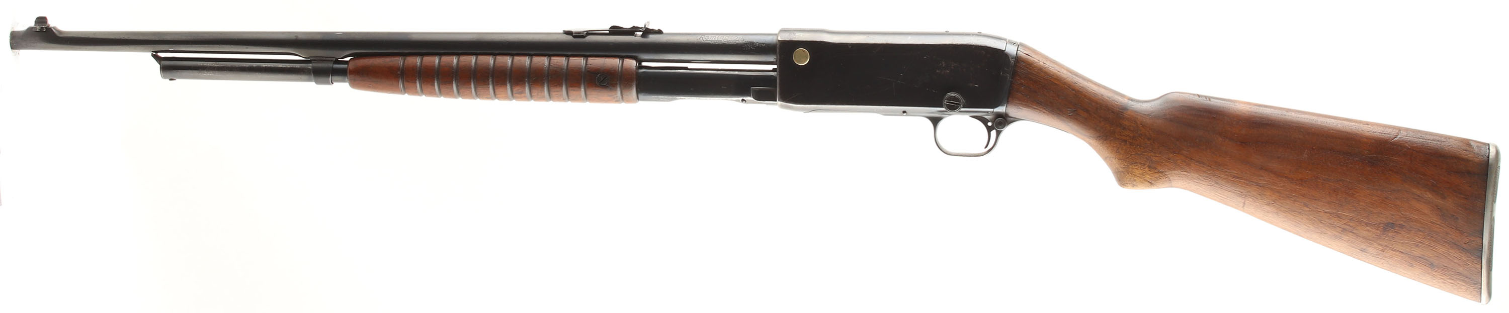 Remington, Model 14, .30 REM Cal., MFG. 1917, SN: 54148, Pump Auction Rifle, 22'' Round barrel, The rifle has been rechambered to 30 Rem, with the caliber marking being altered & displaying a ''30'' punch dot marking. The original flat pistol grip wood stock is fair & still solid, despite 8, 1'' to 2'' glued stress cracks at the wrist at the receiver or lower tang. Unfortunately, these stress cracks are very common to this model. The forend also has a few 1'' to 2.5'' stress cracks & a small wood chip. There are numerous minor to small scratches, gouges & contusions, with much of the original finish has worn away. The metal carries a reblue, with 80% coverage on the barrel, 60% on the receiver & mag tube, with some abrasions & cleaned pitting under the blue. The original mag tube has been replaced with a non-twist Remington Model 14 1/2 mag tube. Top of the receiver has two screw filled holes from previous optic mounting. The barrel carries a replaced adjustable rear sight & a King brass bead blade front sight. Bore is very good, bright & clean. The stock carries a fairly rare Remington reverse tear drop metal buttplate, which is a bit misfitting. Jeweled bolt. An early Remington pump shooter. FFL or C&R Req. - Value: 200 to 400