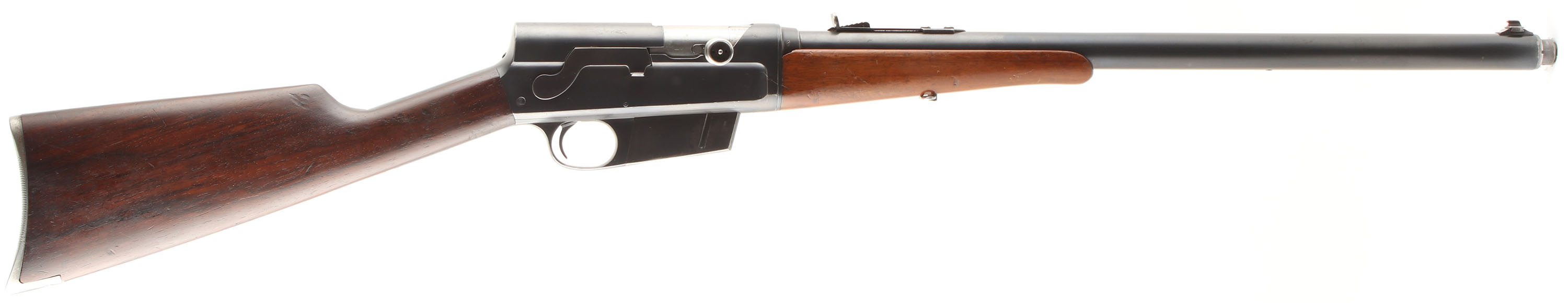 Remington, Model 8, .35 Rem Cal, MFG. 1908, SN: 11673, Semi-Auto Rifle, 22'' barrel. The original straight grip & schnabel forend stocks are very good, with the stock having been cleaned, lightly sanded & reoiled. There are minor scratches & handling marks remaining, along with some larger contusions & scrapes. The forend also displays numerous minor scratches & contusions, with corners chips at the back end & a sliver of missing wood along the left edge. The original metal blue finish rates 85% on the barrel & 75% on the receiver, with even wear loss or thinning from honest use. Bore is excellent, bright & clean. The barrel carries a standard adjustable rear & blade front sights. The stock carries a serrated & bottom tang, crescent metal buttplate. 4 round fixed magazine, with some contusion dents on the belly. Tight action. An overall nice looking & great shooting condition rifle. FFL or C&R Req. - Value: 500 to 1000