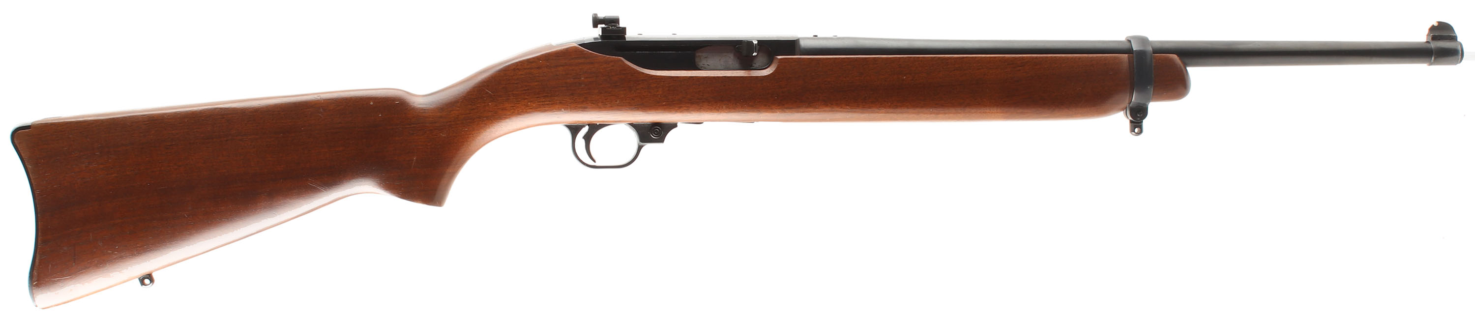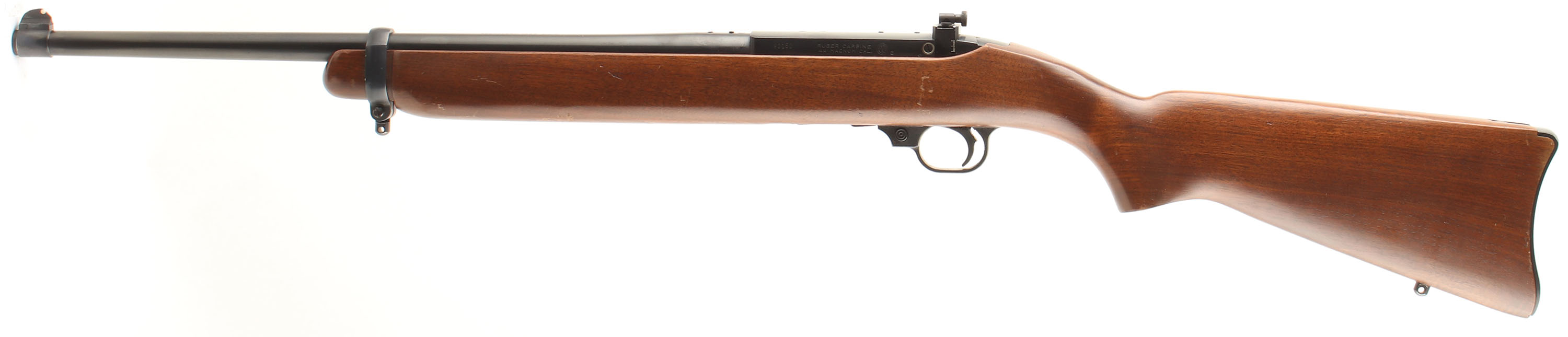 Ruger, Model 44 Carbine, CAL: 44 MAG, MFG: 1964. SN: 90152, Semi Auto Rifle, 18 1/4'' Barrel. The factory wood stock is in very good, near excellent, condition. The stock is solid with light handling wear & some, scratches, and dings. The blued finish on the barrel and frame rates 97% with some splotches of patina and exposed gun metal grey. Bore is excellent, bright with strong rifling. Mechanically solid, seems to function well. The top of the frame holds a windage & elevation adjustable rear peep sight. A fixed front sight with a white plastic insert is set in a dovetail cut on the end of the barrel near the muzzle. FFL or C&R Req. - Value: 700 to 1400