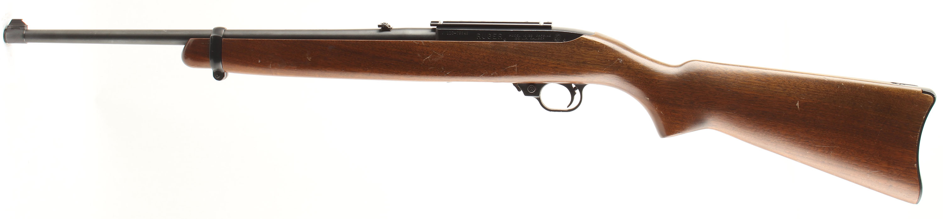 Ruger, Model 10/22 Carbine, CAL: 22 LR, MFG: 1971, SN: 110-79848, Semi Auto Rifle, 18 1/2'' barrel. The flat pistol grip wood stock is excellent , but with a number of small scrapes, scratches & contusions to the original finish. The metal blue finish rates 90%. Bore is excellent. The barrel holds a standard folding leaf rear sight & blade front sight. Top of the receiver caries a scope mounting bar for future scope mounting. Buttstock carries a smooth metal buttplate. FFL & C&R Req. - Value: 200 to 400
